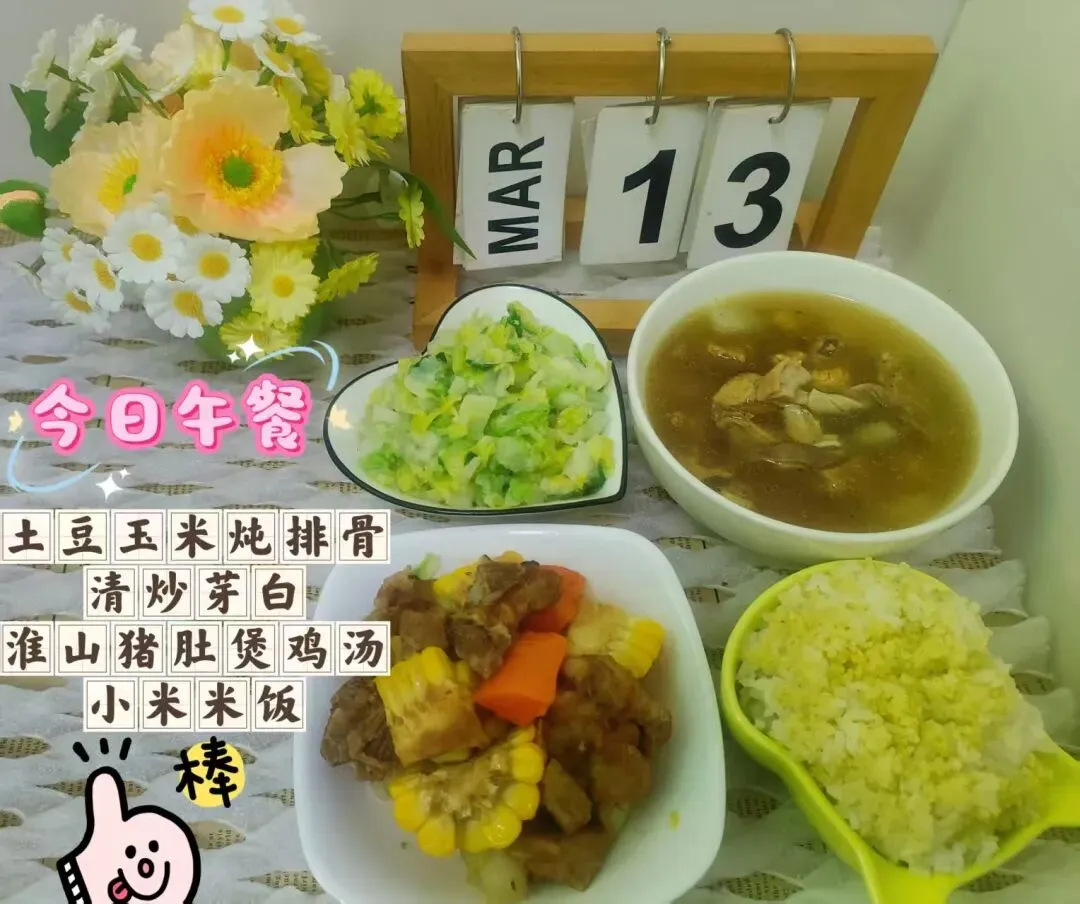 土豆玉米烧排骨、清炒芽白、老姜猪肚煲鸡汤、黄金米饭