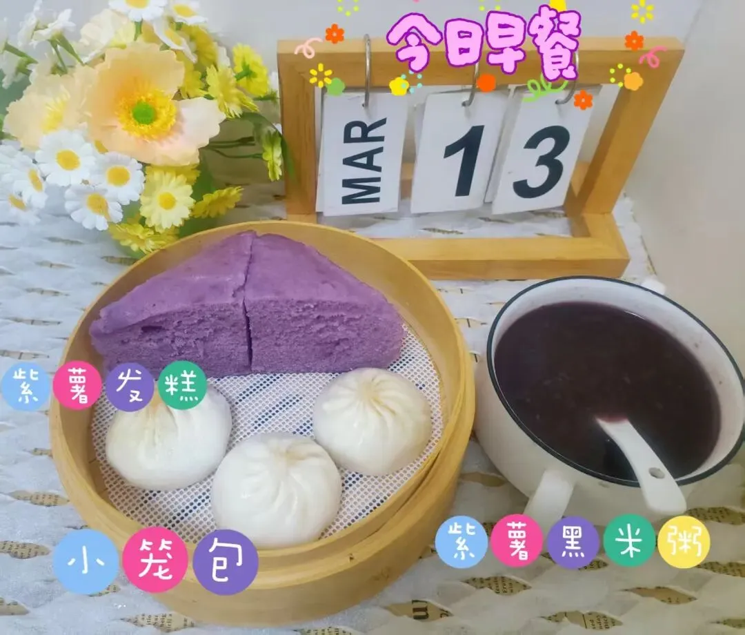 紫薯黑米粥、小笼包、紫薯发糕