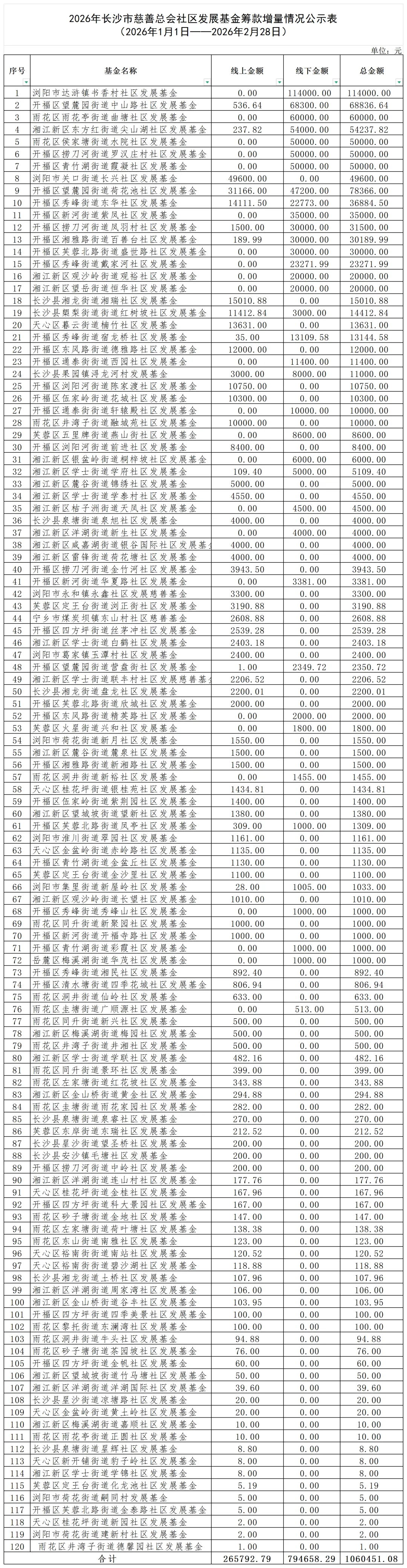 从2026年1月1日至2026年2月28日,长沙市慈善总会共有120支社区发展基金募集资金106.04万元。 其中,长沙“爱星社”线上筹款26.57万元,线下筹款79.47万元。现将各社区发展基金筹款增量情况公示如下: