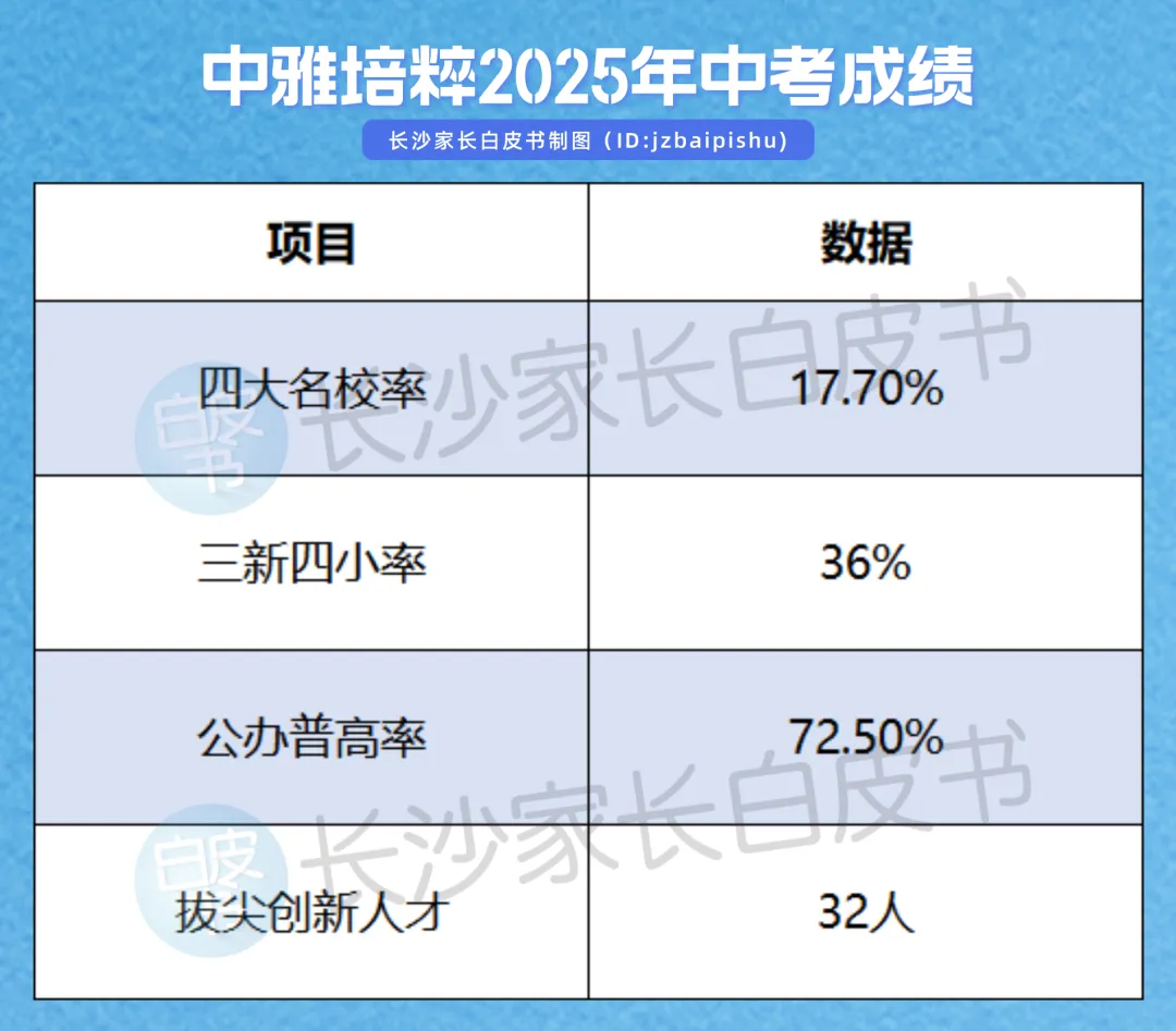 四大率17.7%,三新四小率36%,公办普高率72.5% ,这个成绩在长沙所有初中里,稳居第一梯队。