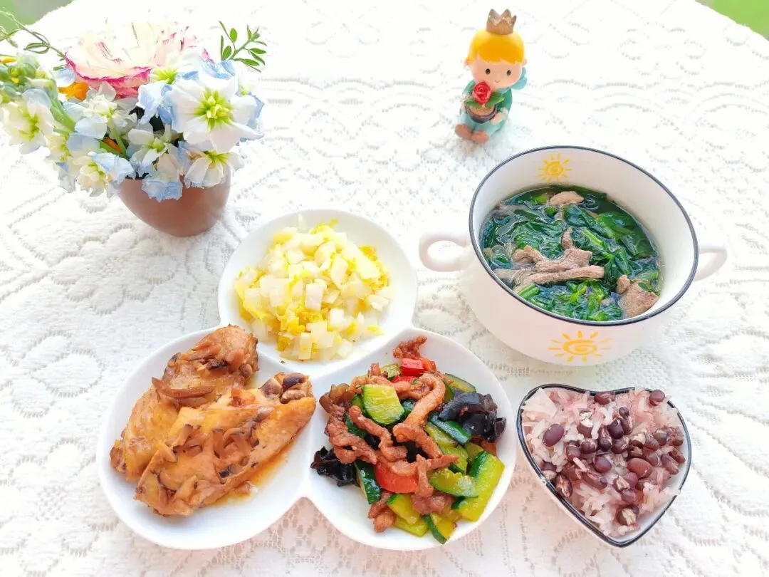 黄瓜木耳炒肉丝 菠菜猪肝肉末汤