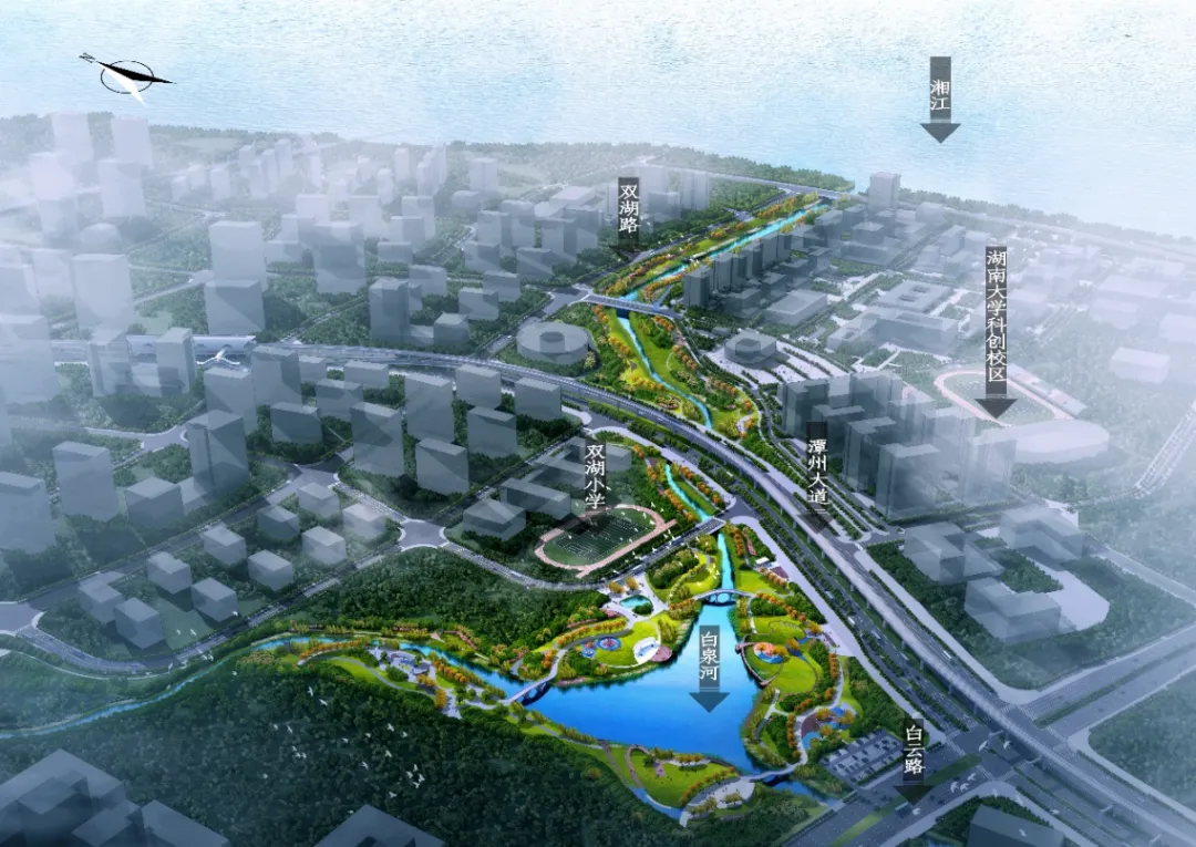 项目位于湘江科学城双湖路以南,潇湘大道以西,湖南大学科创港校区以北,通过打通白泉河与观音港两大水系,构建一条贯穿首开区的生态水脉。