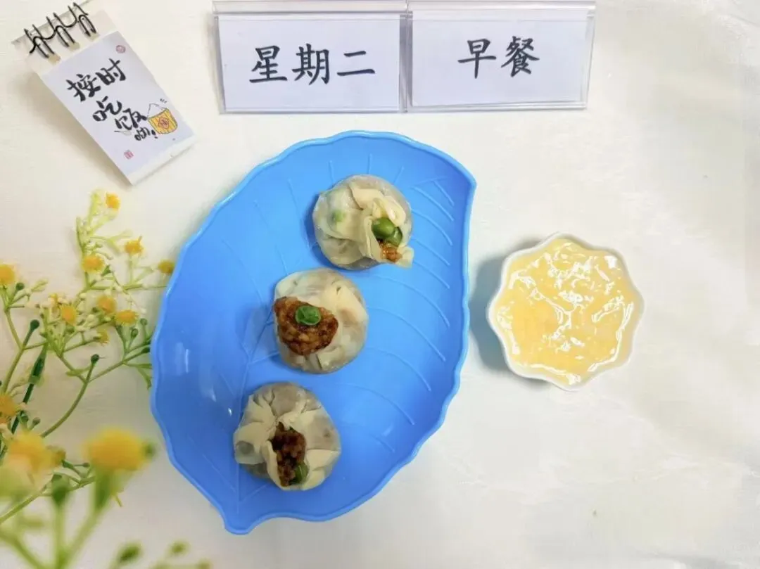 牛奶、蒸山药、鹌鹑蛋、鲜肉蒸饺、香浓南瓜粥、鲜肉小汤包、青菜肉丝蛋炒粉
