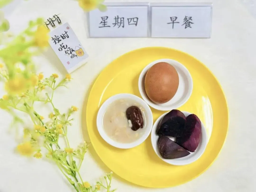 蒸紫薯、五香鸡蛋、红枣燕麦粥