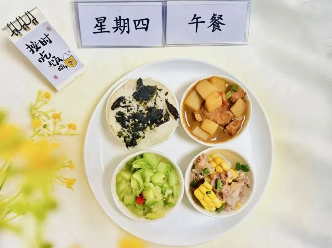 海苔大米饭、玉米炖排骨、土豆蒜球烧肉、小炒西葫芦