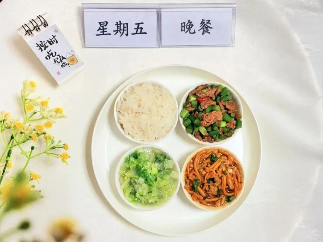大米饭、虫草花肉末汤、黄瓜炒肉丝、豆芽炒粉条