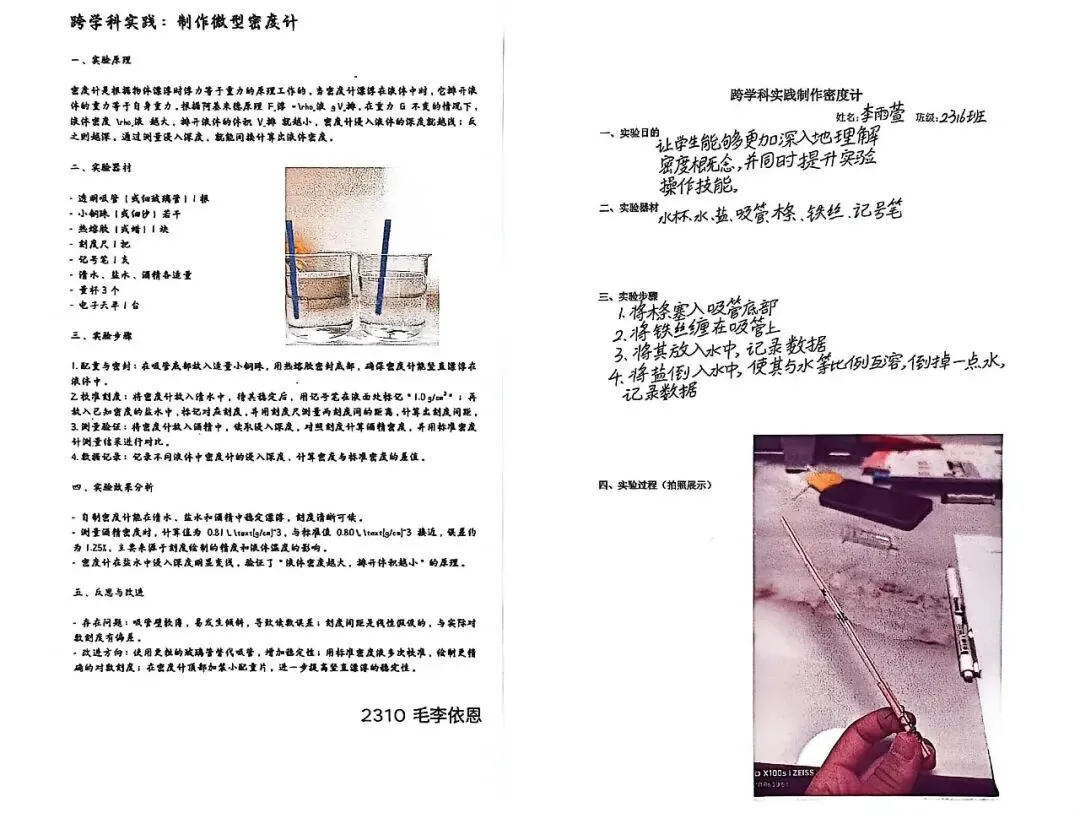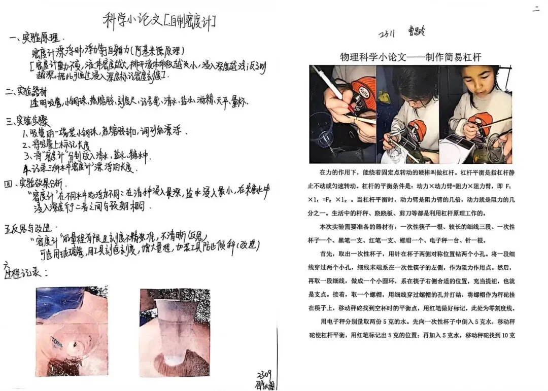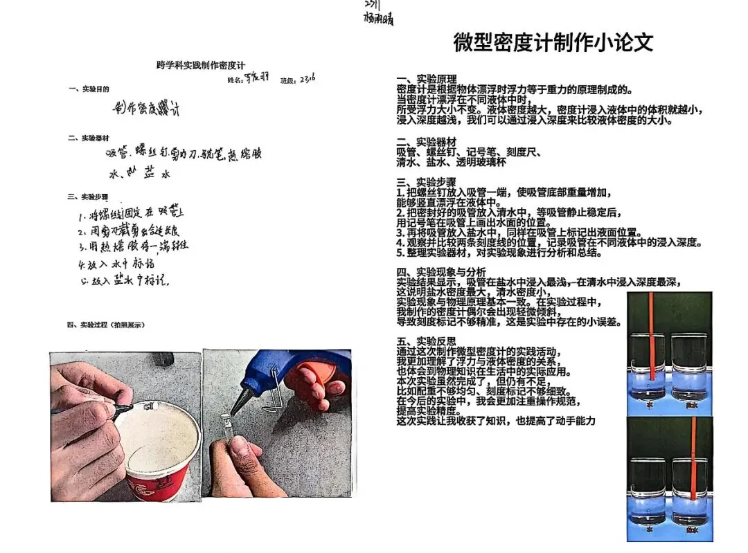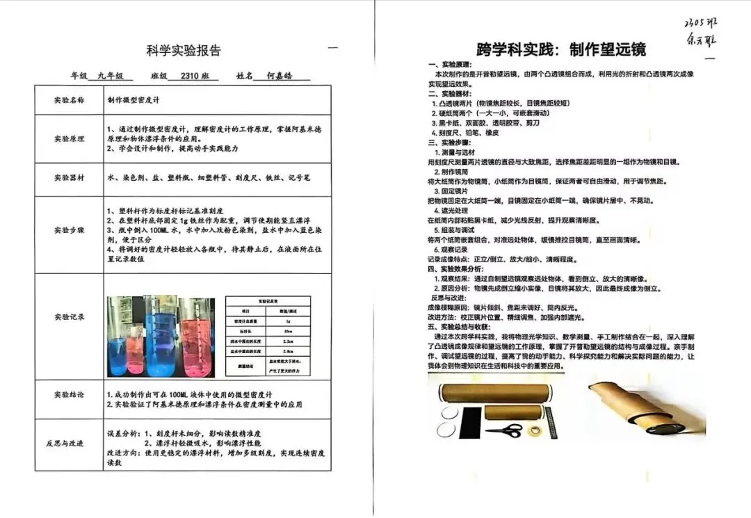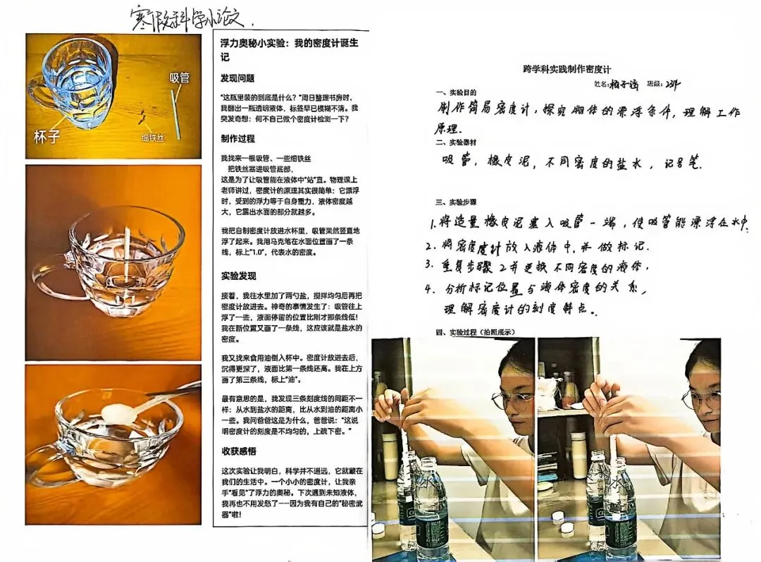 生活即课堂,探索无止境。 在这个假期里,同学们走进广阔的生活大课堂。从日常现象中捕捉物理的踪迹;他们积极思考、大胆假设,自主探究每一个奇妙的实践原理。从精心准备实验器材,到一丝不苟地记录制作过程,每一个细节都闪耀着思维的火花。