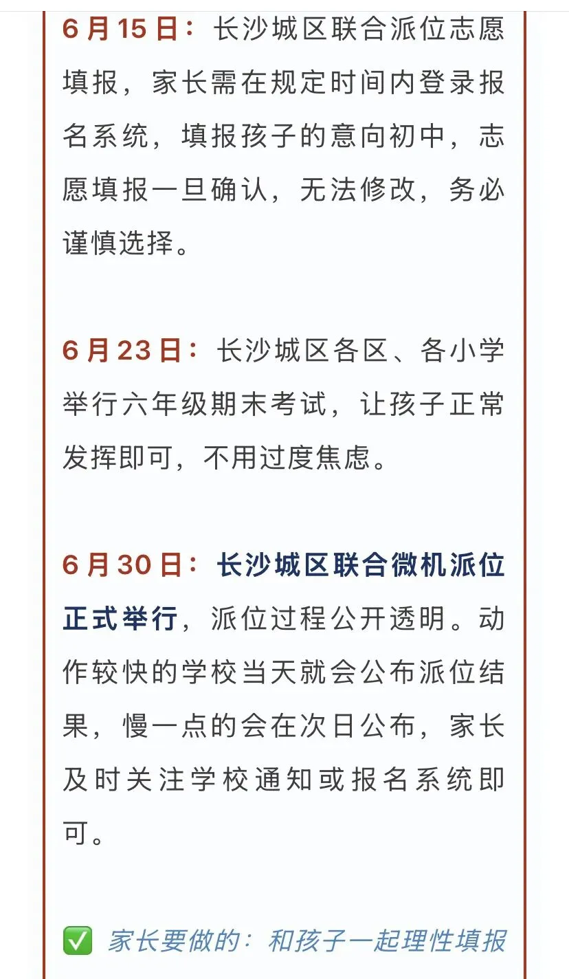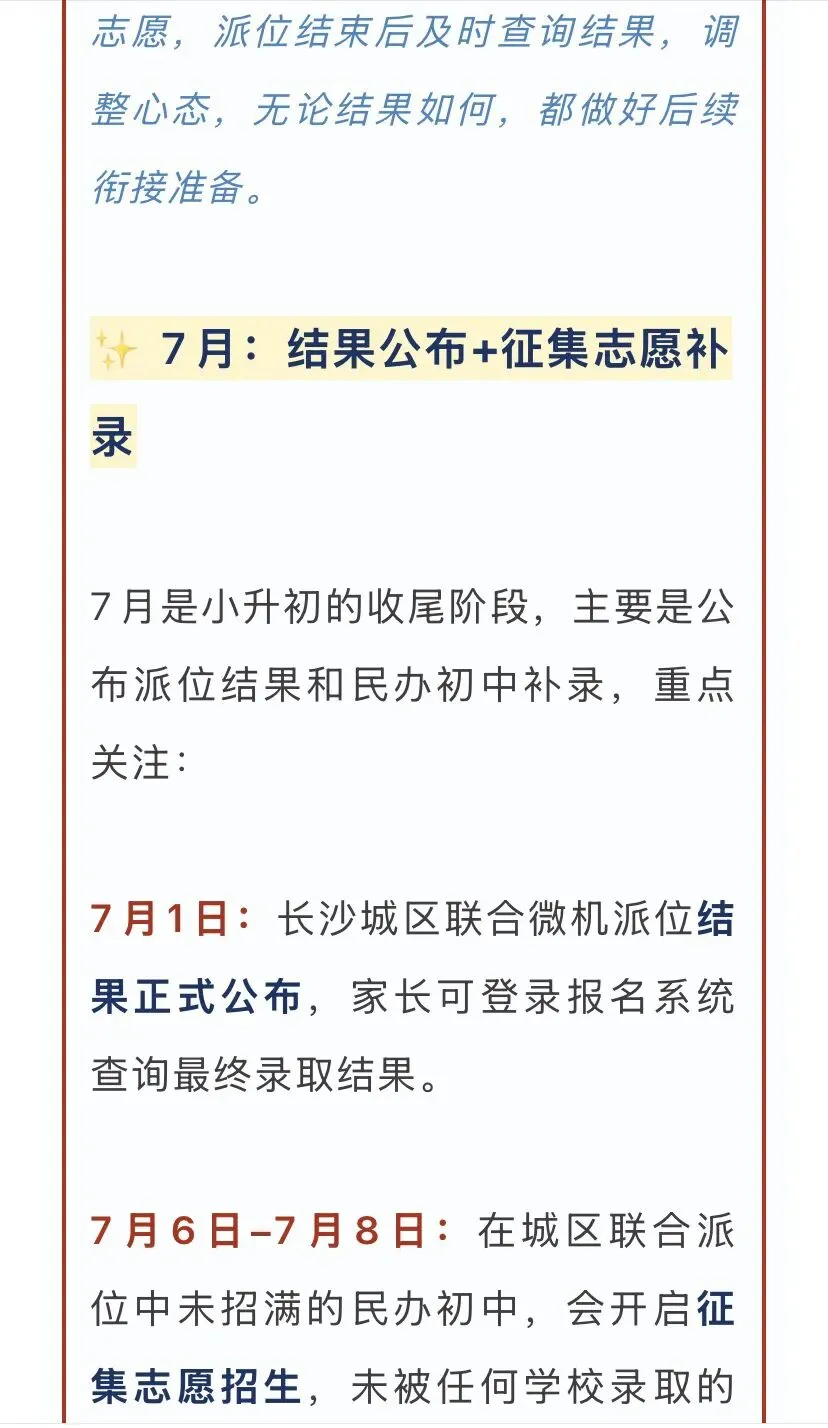 以下时间节点及流程均参考2025年长沙小升初官方安排,2026年若有微调,以当年教育局正式通知为准哦~