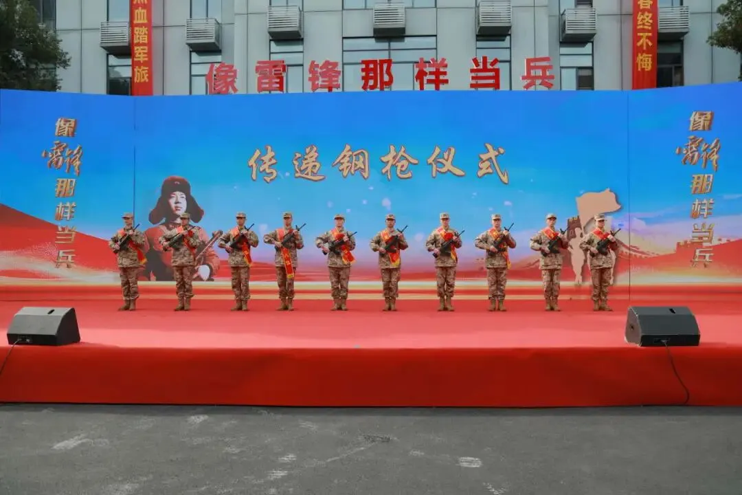 传递钢枪环节,10名退役老兵学雷锋典型代表走上台,为10名新兵代表传递象征红色传统、雷锋精神传承的不朽钢枪。