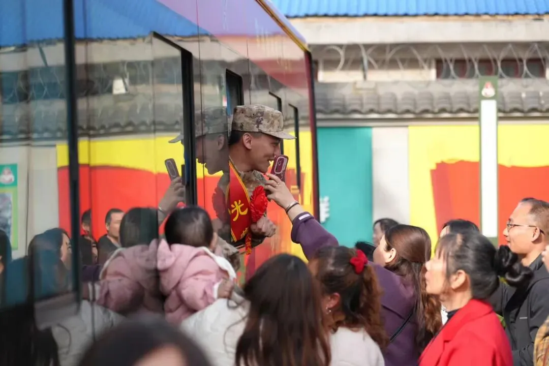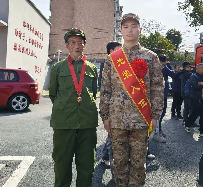 人群中,一位身着旧式军装的老人走到新兵唐渊面前。他是唐渊的爷爷唐孝湖,一名1978年入伍的老兵。他轻声嘱咐:“48年前,我也是像你一样满怀斗志,到了部队要好好训练,听招呼守规矩,为家乡争光!”