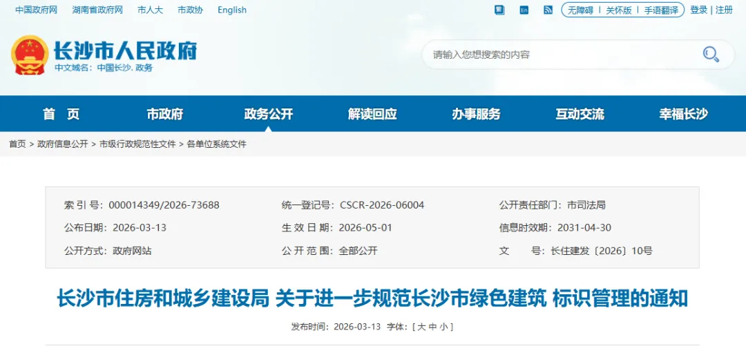 近日,长沙市住房和城乡建设局发布《关于进一步规范长沙市绿色建筑标识管理的通知》(长住建发〔2026〕10 号),从标准职责、建设管理、申报认定、运行监管等多方面出台明确规定,进一步规范绿色建筑标识管理,推动长沙绿色建筑高质量发展。该通知自2026 年 5 月 1 日起施行,有效期 5 年。