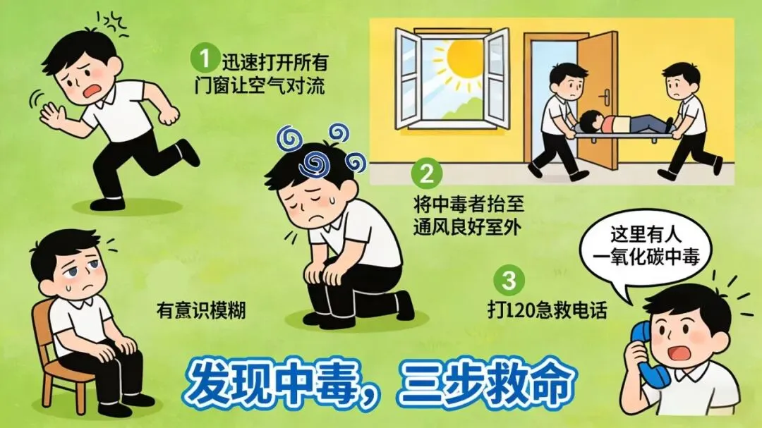 若出现头晕、恶心、意识模糊等中毒症状,立即行动: