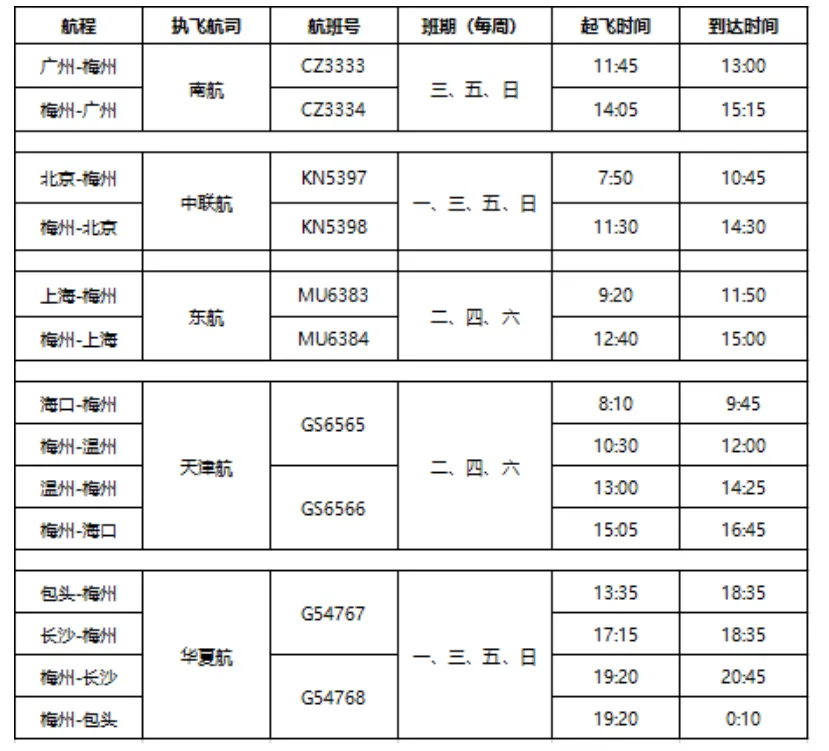 新增上海=梅州航线,航班号为MU6383/4,班期为周二、四、六;新增包头=长沙=梅州航线,航班号G54767/8,班期为周一、三、五、日。