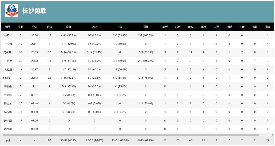 北京时间3月13日19:30,2025-2026赛季全国男子篮球联赛常规赛第二十三轮继续进行,长沙勇胜客场挑战安徽皖江龙。本场比赛,长沙勇胜前三节火力全开,外线投射精准,带着23分的领先进入第四节。但末节安徽韧性十足,勇胜也稍有松懈,被对手快速追分。好在最后顶住压力,投入关键罚球,并防住对手的搏命三分,以88:84拿下安徽。