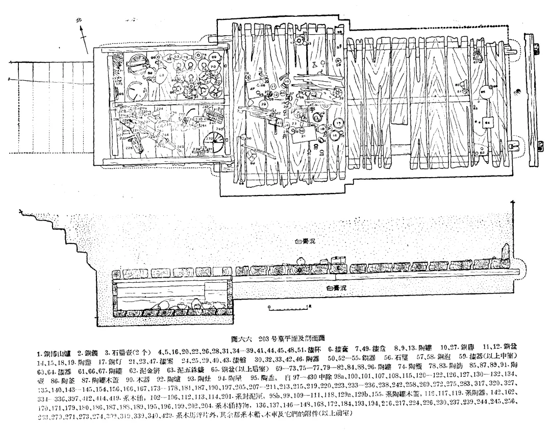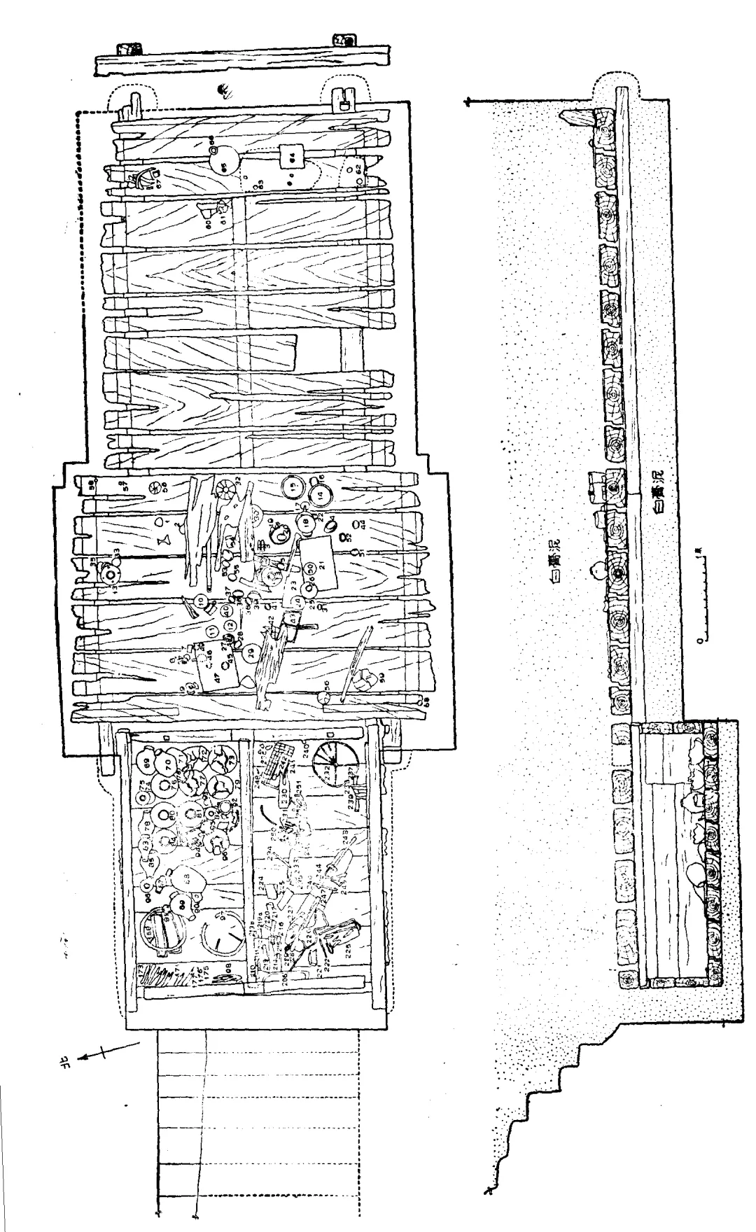这墓遭受盗掘,后室器物所遗无几,位置亦已扰动。中室剩余甚丰,有陶器、铜器及多量的漆器,都混在一起,排列无序;铜镜和石壁亦在此发现。前室保存情形最好,北室上层是数十件陶器,下瘤主要是一个木车模型和许多件木俑;南室主要是四个木车模型、一个木船模型和若干件木俑。
