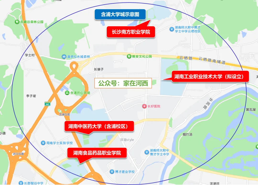 截止目前为止,含浦大学城已经聚集了:湖南中医药大学(含浦校区)、湖南工业职业技术大学、湖南食品药品职业学院、长沙南方职业学院等高等院校。