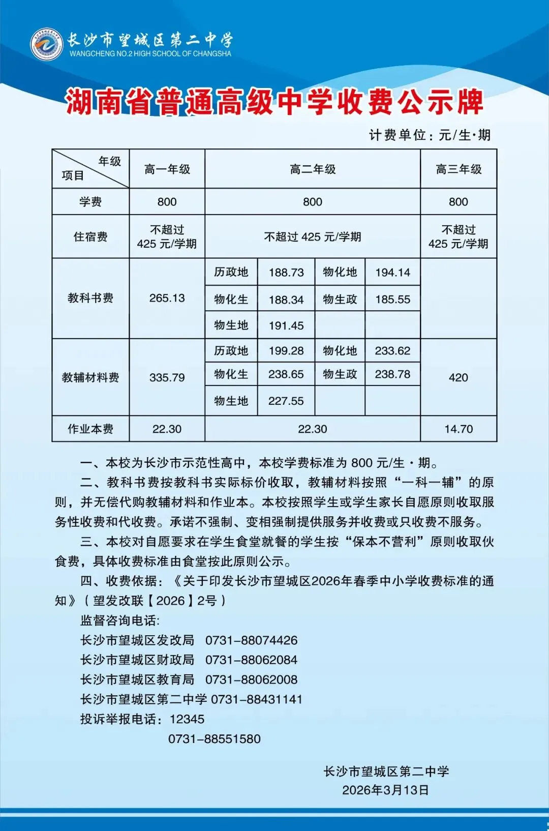 >长沙市望城区第二中学2026年春季收费标准公示