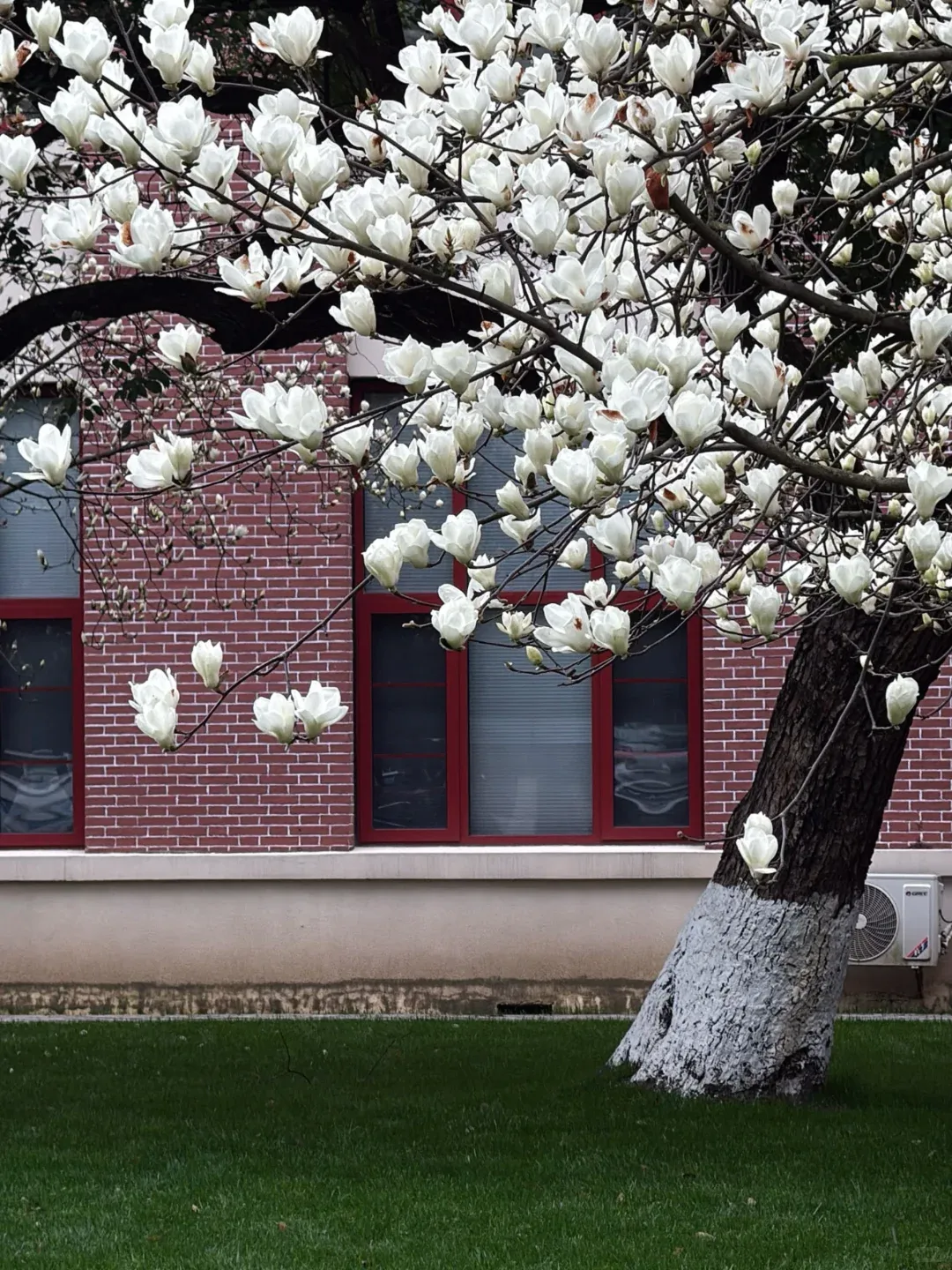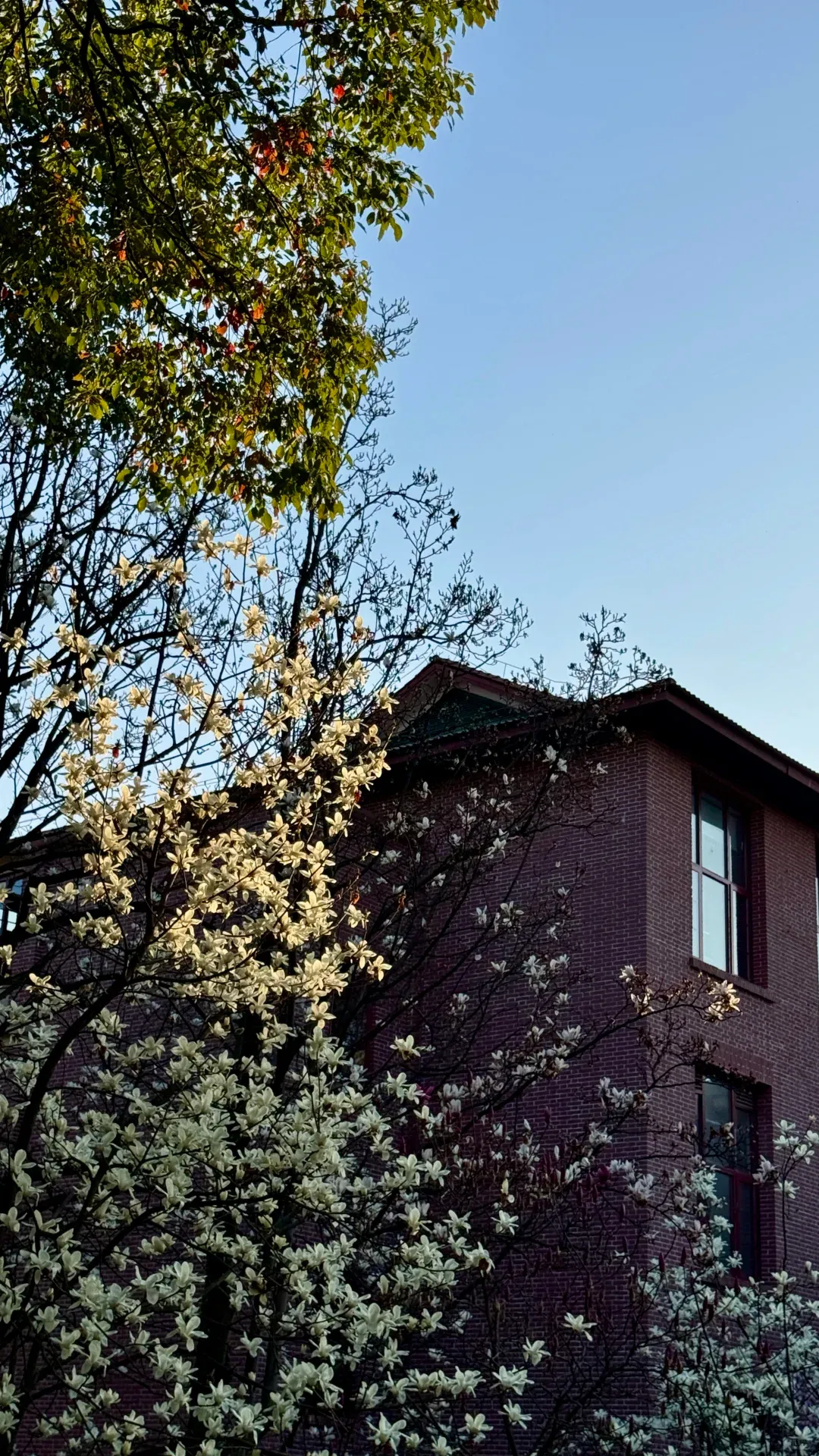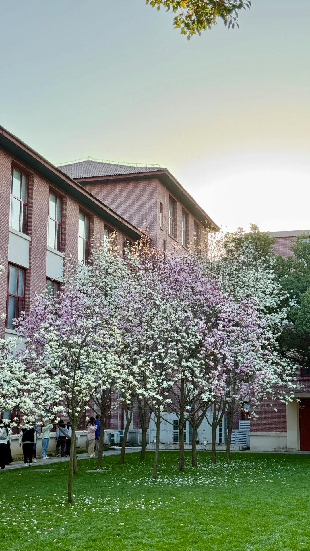 集中在一教和思源馆旁边,花枝不算高,纯白+淡紫双色玉兰并肩开放,干净又温柔。站在树下,风一吹花瓣轻轻飘落,文艺氛围感直接拉满。
