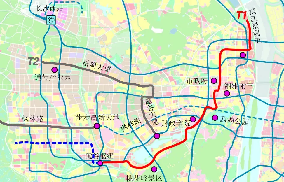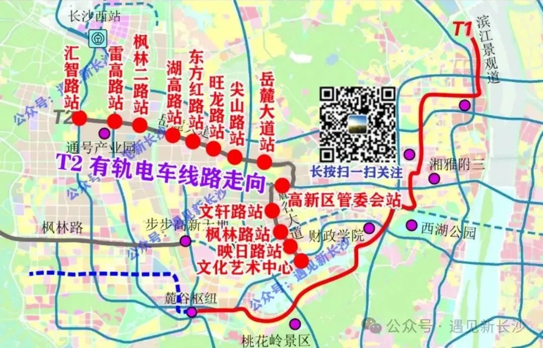 通常来说,中运量轨道交通可以是有轨电车,也可以是无轨电车(即智轨),区别主要在于有没有物理轨道。从以上回复,结合此次含浦有轨电车招标,长沙第二条智轨大概率落户梅溪湖,而梅溪湖规划了高铁西-梅溪湖T2线智轨、市府—梅溪湖T1线智轨。最新进展:近期,湘江新区开发建设局回复,长沙T2有轨电车项目目前正在进行前期方案研究工作,因周边地块开发尚不完善,资金及规划条件仍需深入论证。线路走向:长沙T2有轨电车梅溪湖高新区线起于梅溪湖文化艺术中心,沿临水路-麓谷大道-桐梓坡路-麓枫路-岳麓大道敷设,止于岳麓大道与汇智路交叉口。设计时速:70—80公里/小时