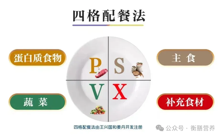 把一个餐盘或模拟餐盘划分成4个格子,每一个格子分别装上不同的食物,即主食(S)、蛋白质食物(P)、蔬菜(V)和补充食材(X)。“主食”(Staple food)是指谷类(米、面、杂粮等)、薯类(土豆、红薯等)和杂豆类(如红豆、绿豆等),要粗细搭配;“蛋白质食物”(Protein food)是指鱼肉蛋奶和大豆制品,每餐必备;“蔬菜”(Vegetables)主要推荐深颜色的种类;“补充食材”(X)是四格配餐法的关键,要根据不同身体情况来安排食物。四格配餐法,简单、实用、有学问(60页PPT全面介绍)