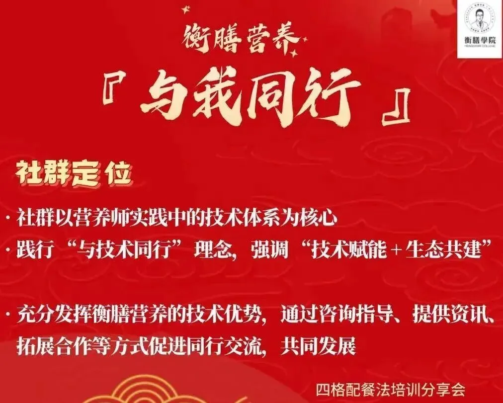 四格配餐法面市四年以来,在王兴国老师的指导下,我带领衡膳营养团队的营养师们一同深耕实践、持续打磨。我们以四格配餐法为核心,开展了大量营养科普工作,包括科普文章、线下讲座与自媒体内容运营;同时深入落地营养服务,将这套方法真正用于日常指导与健康调理。在实践中,我们还指导营养师及相关企业,运用四格配餐法开展产品经营与销售转化,并将其理论体系应用到营养餐的研发与落地中。《四格配餐法培训分享会》系列就是要讲授我们的方法,分享我们的实践经验,开展交流与合作,全面赋能营养科普、营养服务、营养产品销售、营养餐落地等工作。