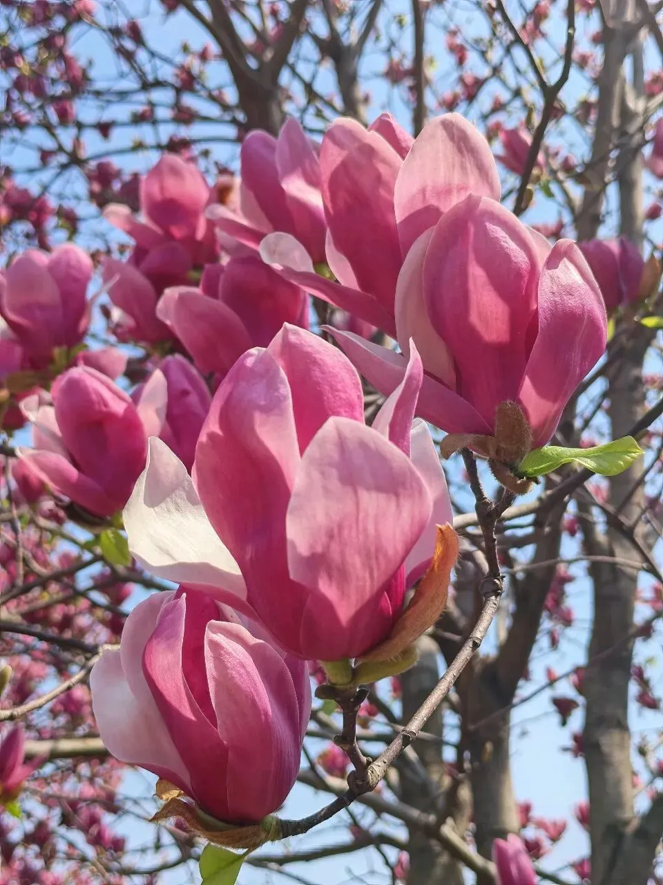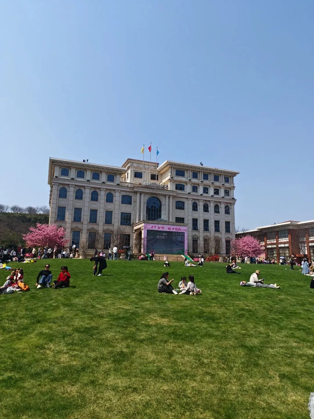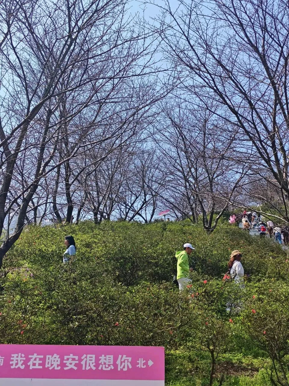 入口大片草坪(请遵循园区规定),野餐垫一铺、也是全家享受春日阳光的好地方。如果娃电量还满格,可以带他沿着步道往山上走,开启一场轻量的“自然徒步”。目前山上的樱花大多还是花苞(如图),正好可以教娃认识“花蕾”和“盛开”的不同。