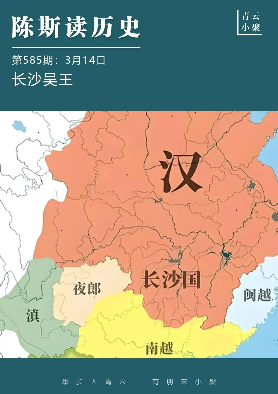 今天我们继续讲中国历史上著名的辉煌王朝——西汉的故事。诛杀彭越之后,刘邦对于梁国及周边的领地是如何处置的? 分封自己的子侄兄弟为王,以血缘纽带维系汉家天下的稳定,这一意图能够实现吗?长沙国在秦汉之际是个非常特殊的存在,刘邦死前翦除了几乎所有的异姓诸侯王,为什么偏偏留下了长沙国?长沙国直到汉文帝执政后期才被撤销,这与它的地缘特点以及其在秦汉之际发挥的特殊作用有什么关系?在秦末天下大乱及楚汉战争时期,吴芮对整体形势的把握非常精准,为何秦王朝、项羽和刘邦都愿意重用吴芮呢?长沙国的地缘位置,以及吴氏家族在当地的影响力,对于中央政权有哪些重要的作用呢?欢迎关注青云小聚,收听《陈斯读历史》音频,看陈斯先生如何为我们解读。