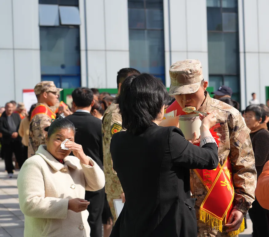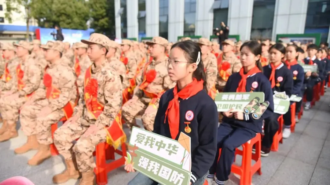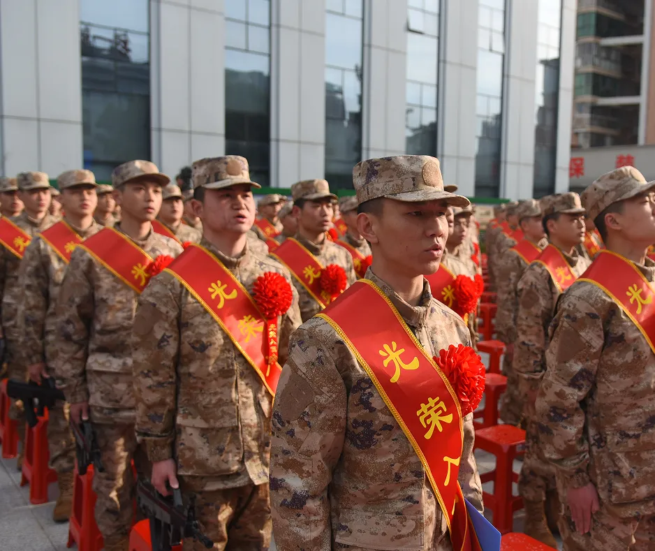 仪式尾声,全体新兵与湖南工商大学民兵合唱团齐声合唱雷锋家乡子弟兵从军歌《当兵去》。铿锵激昂的旋律,赤诚热烈的歌词,诉说着雷锋家乡子弟兵的家国情怀。