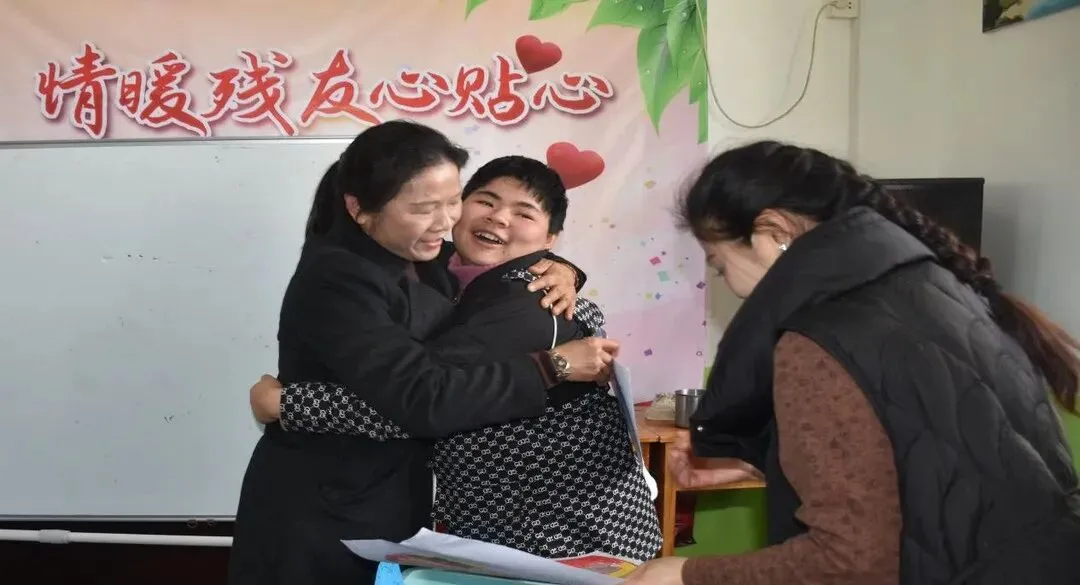 在工作人员的悉心引导下,学员们力所能及地回应外界的善意。从普通问候到主动分享,每一个略显粗糙却充满心意的手工作品都成了他们传递心意的载体,点滴交流中充满了温暖与感动。学员肖小妹打开自己的“百宝箱”,骄傲地把画着菠萝的卡纸塞到肖红霞手中,仿佛在说这是她能给出的最好礼物,现场的志愿者们倍感动容,肖红霞也忍不住将她抱入怀中,将这份深厚情谊紧紧包裹。