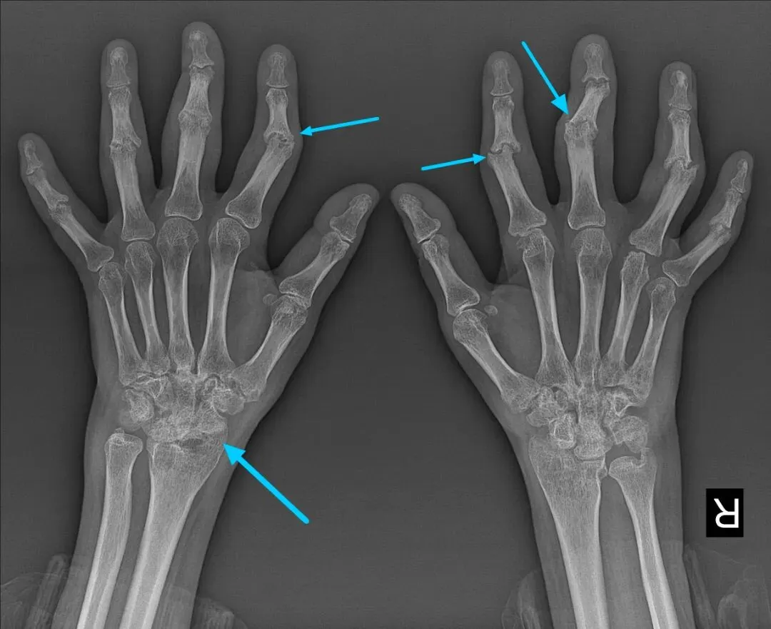 前面4项是血液检查,这一项是影像学检查,主要看关节是否出现骨质破坏、滑膜炎、关节积液等病变。早期类风湿可能X线无明显异常,可选择关节超声(更灵敏,能发现早期滑膜病变);病程较长者,X线可明确关节损伤程度,为治疗方案制定提供依据。