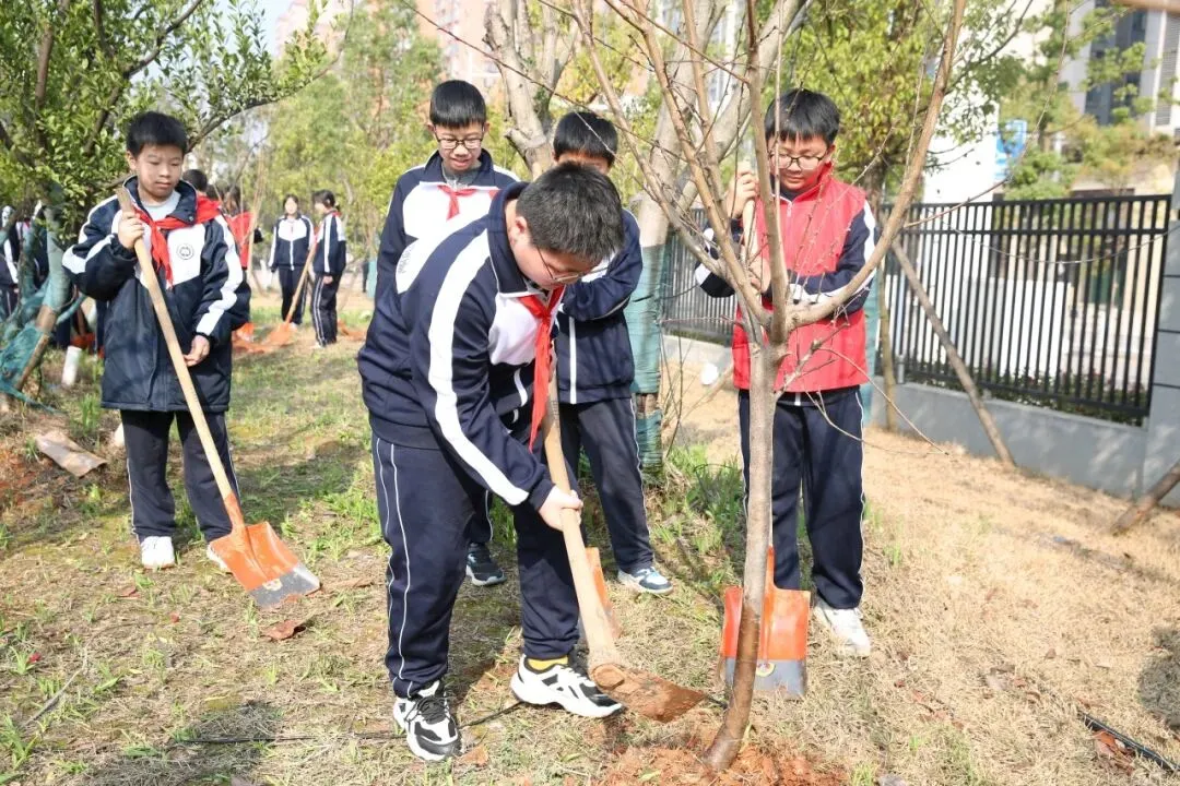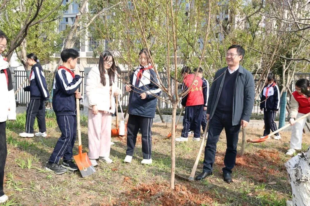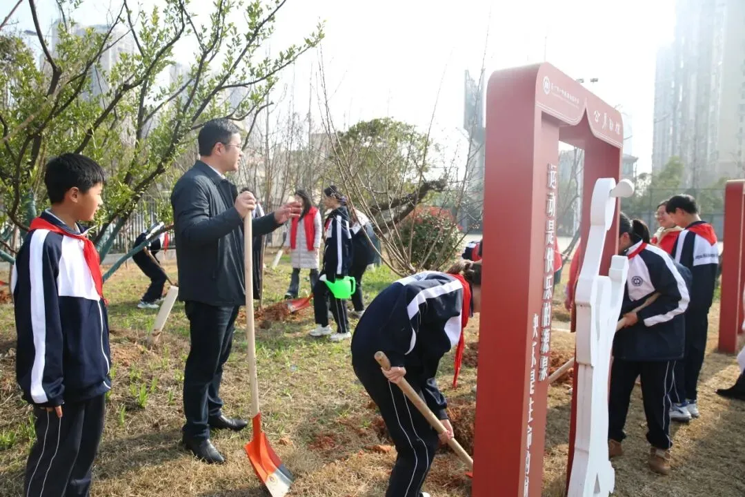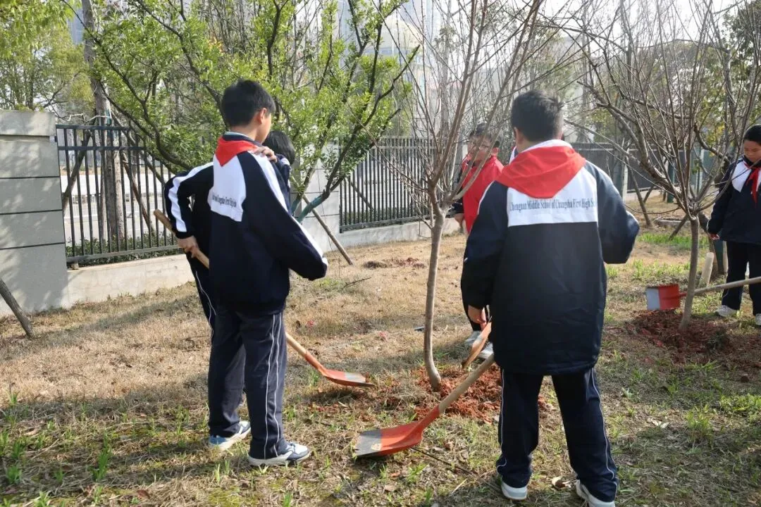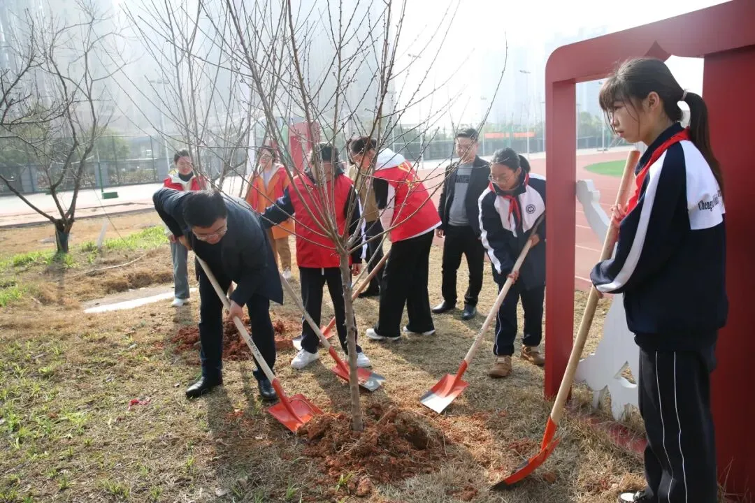 春和景明,万物生长。在第48个全国植树节来临之际,为充分发挥党建引领作用,长沙市一中城南初级中学党支部联合团委精心开展植树节实践活动。学校党支部书记钟文,副校长李艳、彭世髦、梁莎莎带领党员教师、团员、队员齐聚校园草坪,共同栽种桃树苗。活动以 “党建带队建” 为抓手,以劳动实践践行为初心,让 “桃李满天下” 的育人期许在春日里深深扎根,既厚植了校园生态底色,更凝聚了党团队共建的奋进力量。