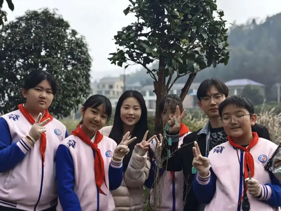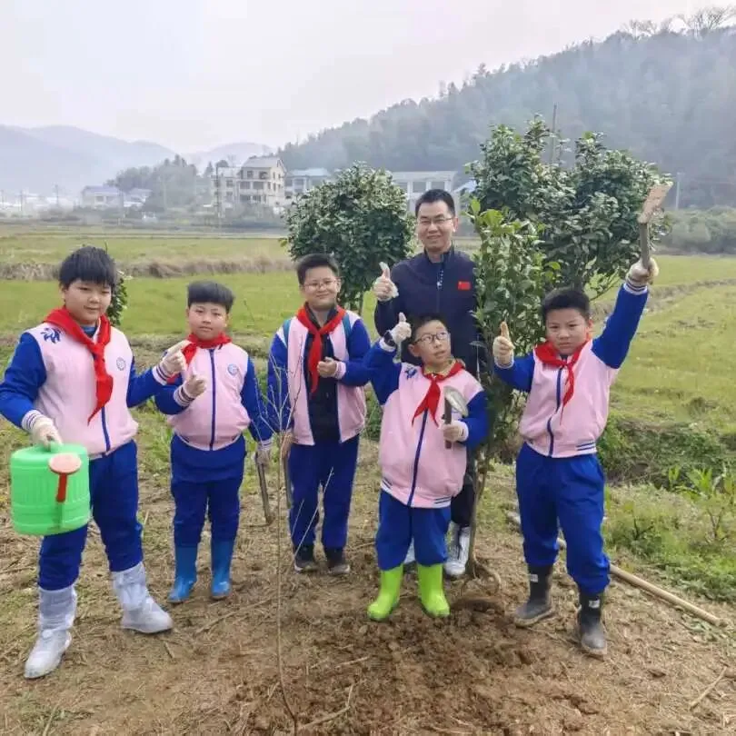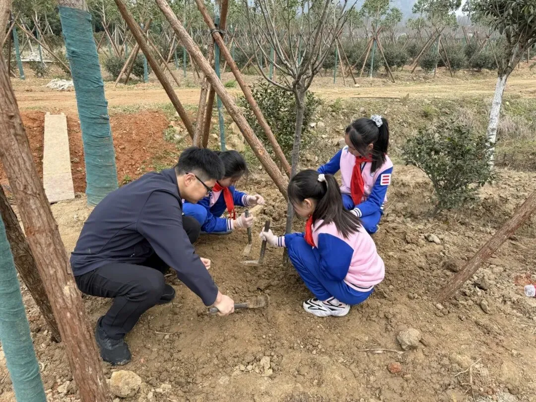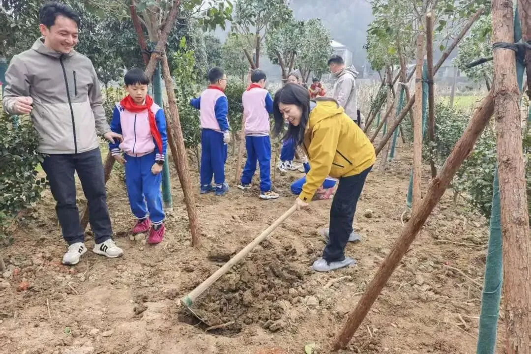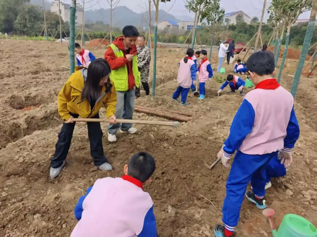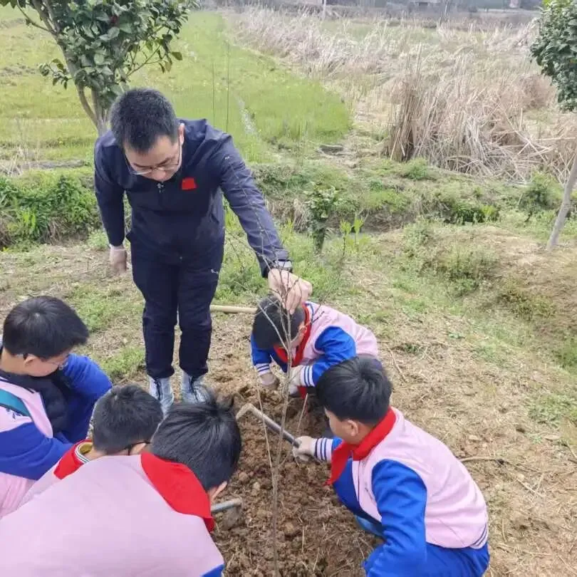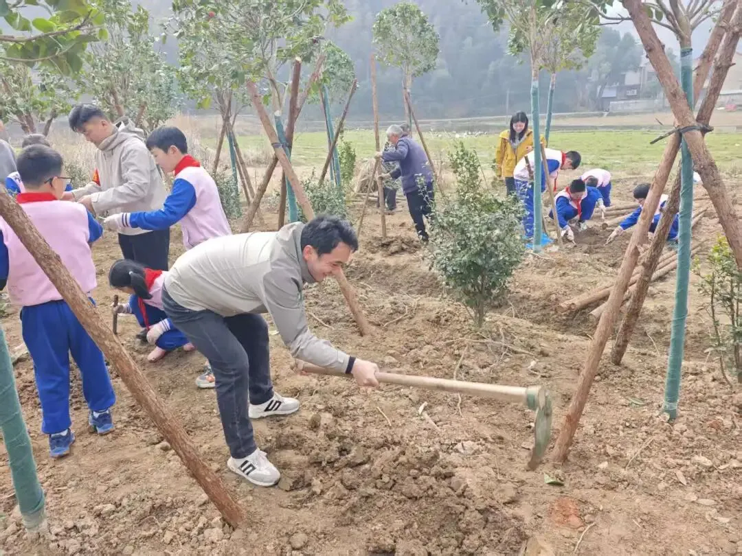回访结束后,师生投入新树种植。副校长张岸蹲下身,手把手教学生将泥土填实;副校长李岳初扶着树苗,指导两名男生培土固根;纪检书记刘章红与三名学生协作挖坑、栽苗。山谷里,铁锹声、水桶碰撞声与欢笑声交织成一片。