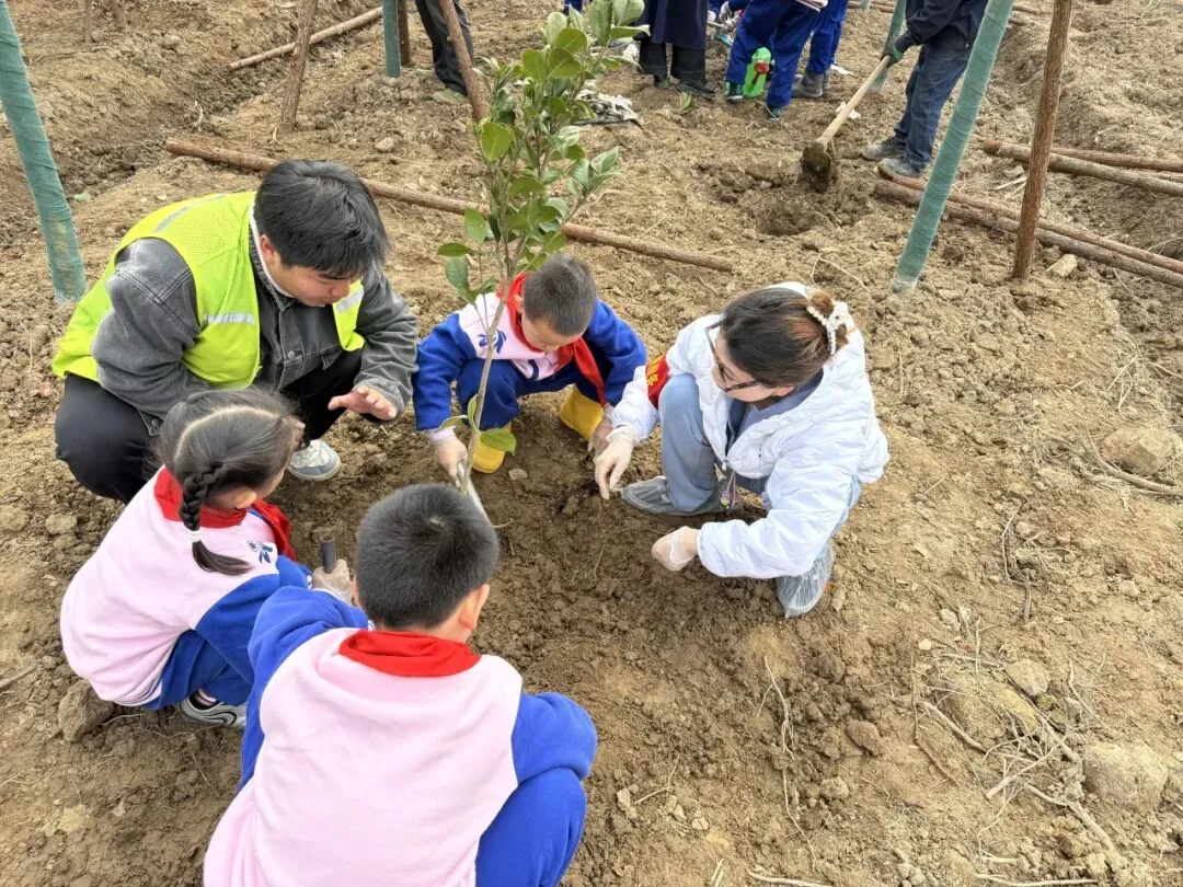 挂牌环节,孩子们写下“我们一起长高”“谢谢你守护地球”等寄语,将木牌系于枝头。