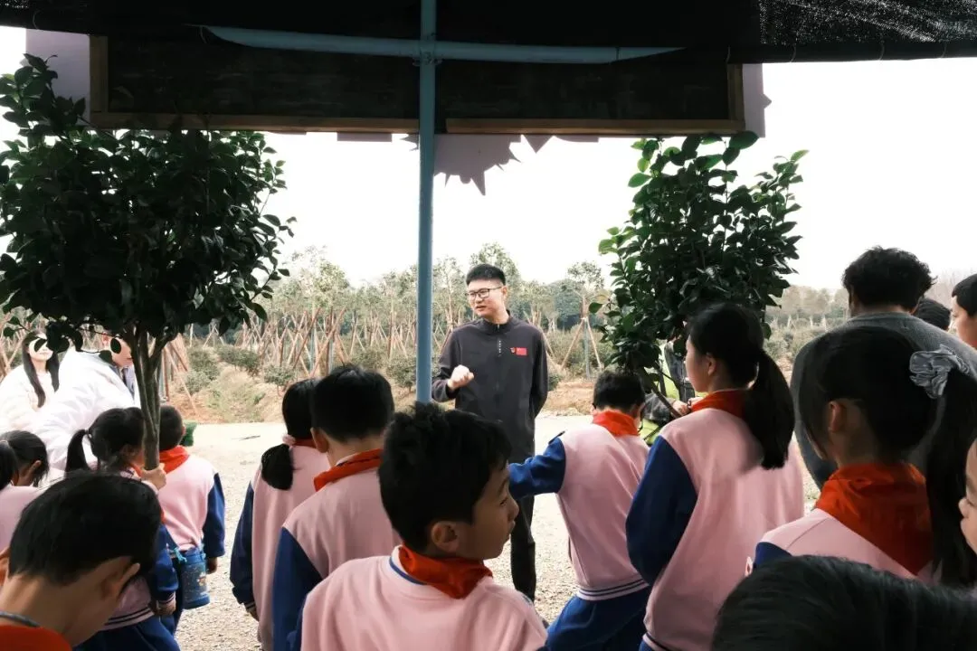 上午9时,师生抵达基地,首先探访去年种下的那片树林。孩子们兴奋地寻找自己栽种的那棵树,并在老师带领下分组除草、松土、浇水。校长余理蹲在一株瘦弱树苗旁对学生说:“成长不在于长得快,而在于扎得稳。小学阶段正是你们扎根的时候,读书、运动、劳动,每一份努力都在向下扎根。”学生若有所思,浇水愈发细致。