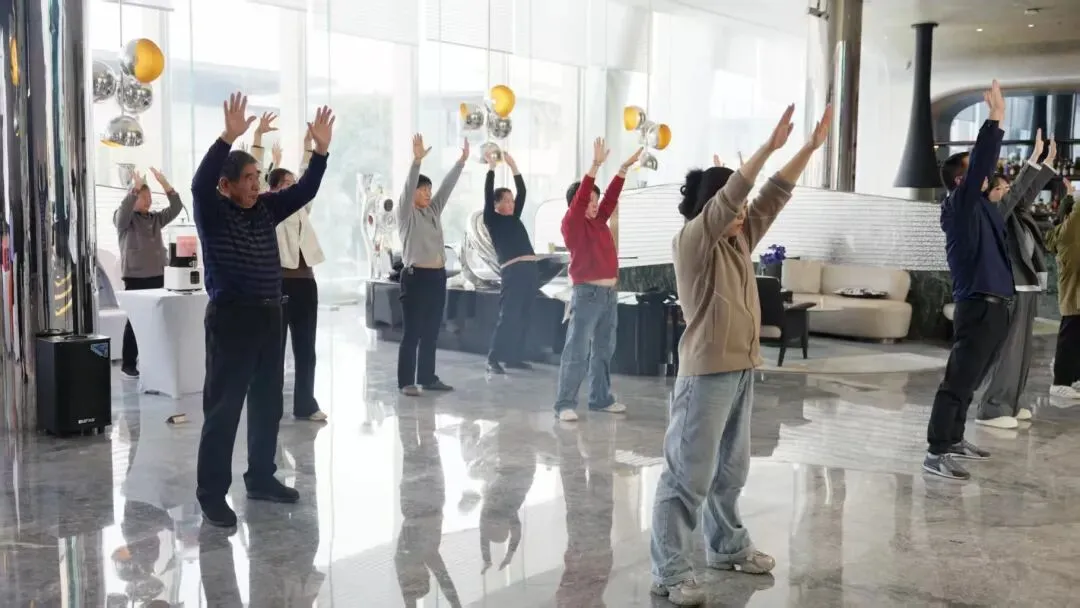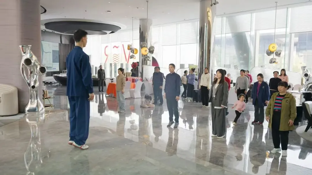 现场我带着大家一起练习八段锦,一群人跟着慢慢舒展、呼吸,氛围特别好。