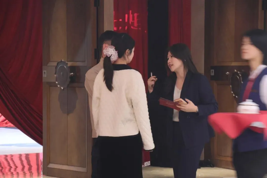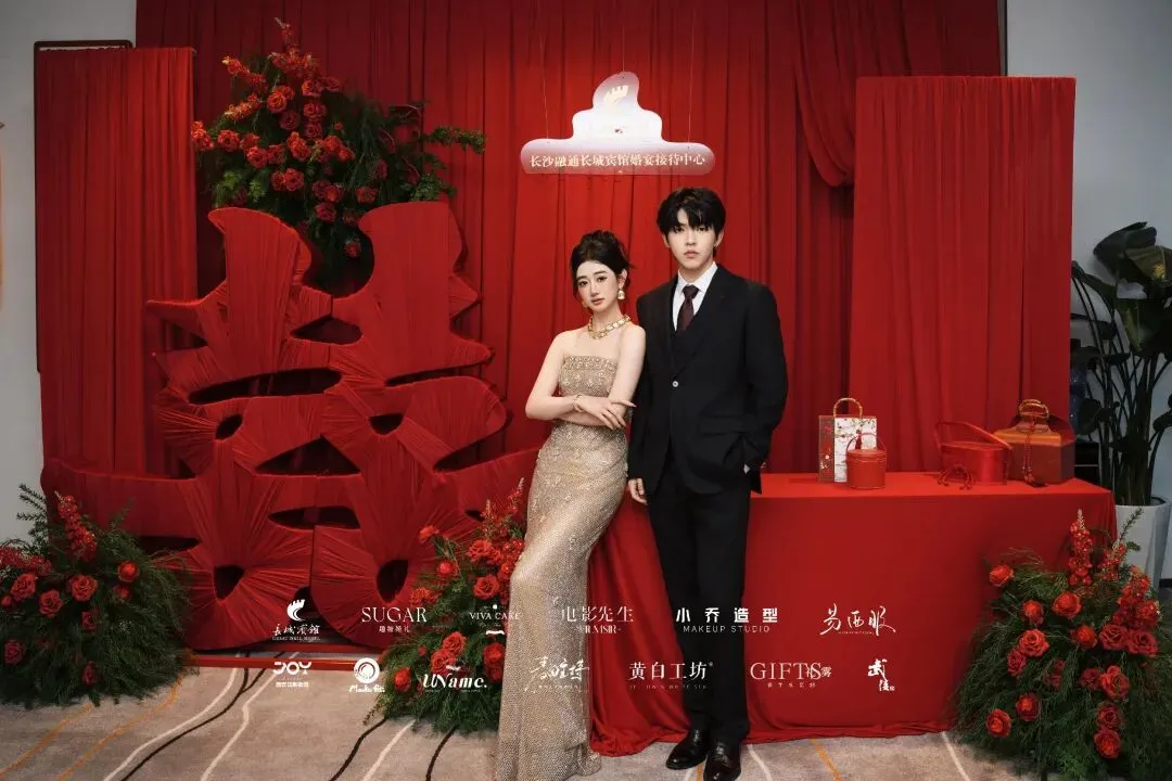活动现场,宾馆巧妙融合了传统与现代元素,将五楼融通厅打造成了一个既具古典韵味又不失现代时尚感的梦幻空间。步入会场,宾客们仿佛穿越至一部正在上演的爱情剧幕之中,红色布幔轻柔包裹的通道,如同提前“入戏”的序章,引领每一位到场者成为故事的一部分。中央的“口字形”T台,搭配巨形装置艺术,不仅构建了沉浸式的观礼体验,更象征着爱情绽放的璀璨瞬间,让每一对新人都能在此找到属于自己的浪漫舞台。