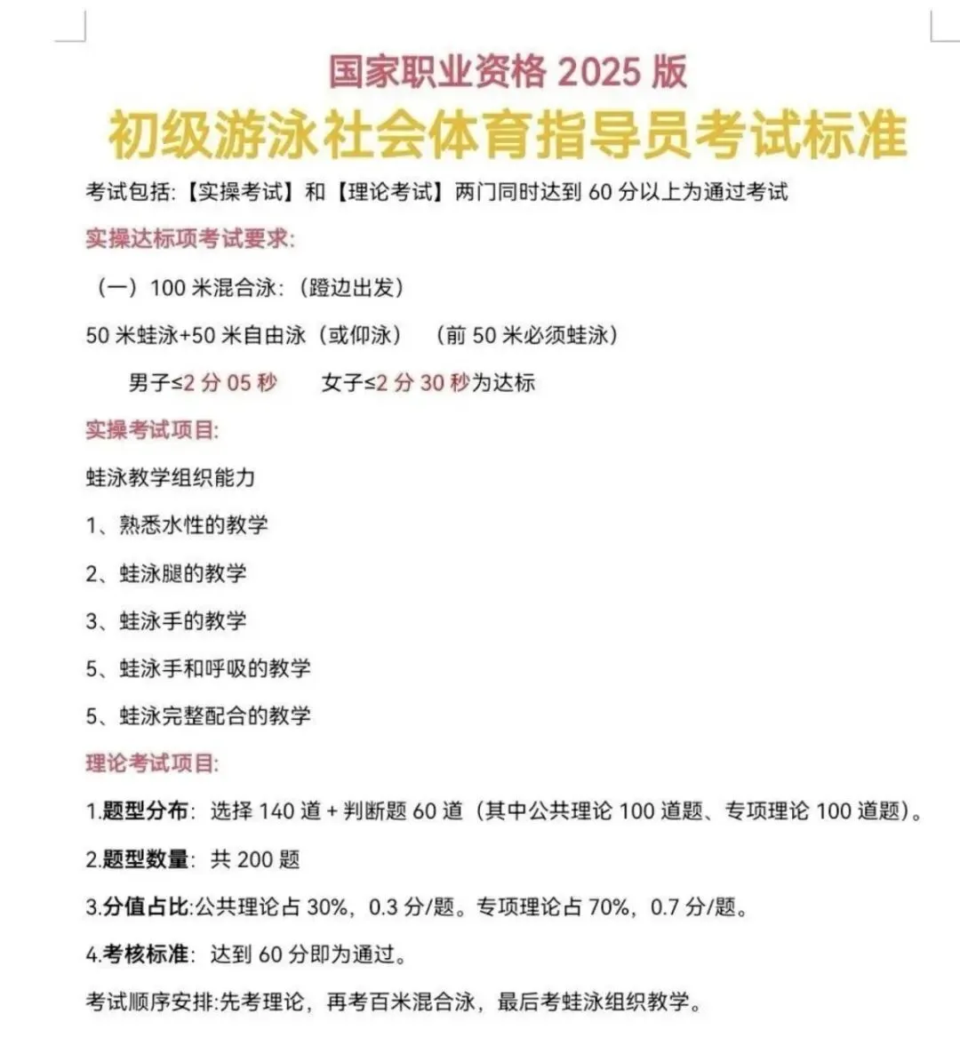 一、游泳指导员初级工(五级)