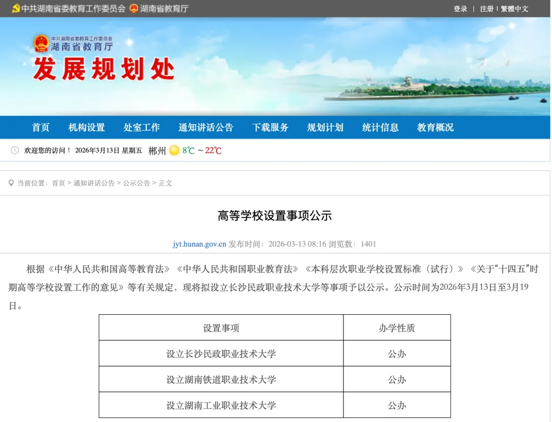 记者3月13日从湖南省教育厅获悉,根据《中华人民共和国高等教育法》《中华人民共和国职业教育法》《本科层次职业学校设置标准(试行)》《关于“十四五”时期高等学校设置工作的意见》等有关规定,将拟设立长沙民政职业技术大学、湖南铁道职业技术大学、湖南工业职业技术大学予以公示。