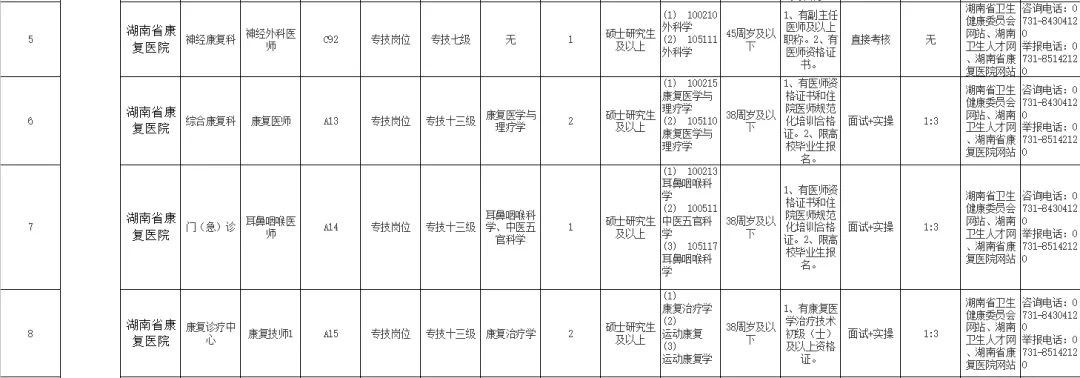 复审:通过资格初审人员全部参加资格复审。复审采取现场审核的方式,考生须将报名材料原件及复印件交招聘单位审查,通过资格复审人员全部进入直接考核。资格复审的时间、地点、通过人员名单和面试通知在湖南省卫生健康委员会网站、湖南卫生人才网、湖南省康复医院官网公布,并通过电话或短信方式联系资格审查通过人员(应聘人员应保持手机畅通)。