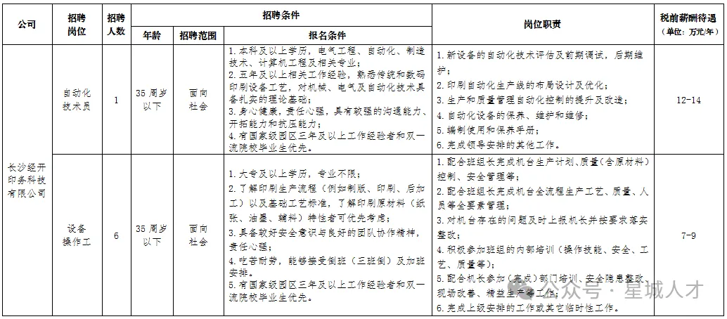 本次共招聘7名工作人员,其中自动化技术员1名,设备操作工6名。具体岗位职责及要求见《长沙经开印务科技有限公司公开招聘岗位及条件一览表》(附件1)。