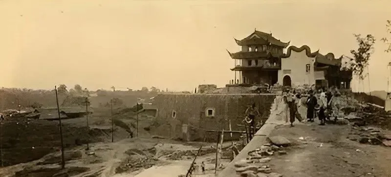 图中这处高挑的城门楼就是那会儿长沙的脸面,墙体颜色发灰,砖缝里糯得发亮,城门洞口被人走出了圆角,外面搭了木杆子做的脚手架,几根斜撑咬在墙身上,木头上留着锤敲过的印子,边上几个人手里攥着粗绳,腰间还别着铁撬棍,脚边堆着碎砖渣子,风一过就拍在裤脚上,城门台阶有点斜,人上去下来的脚步都快,像赶集一样的劲头。