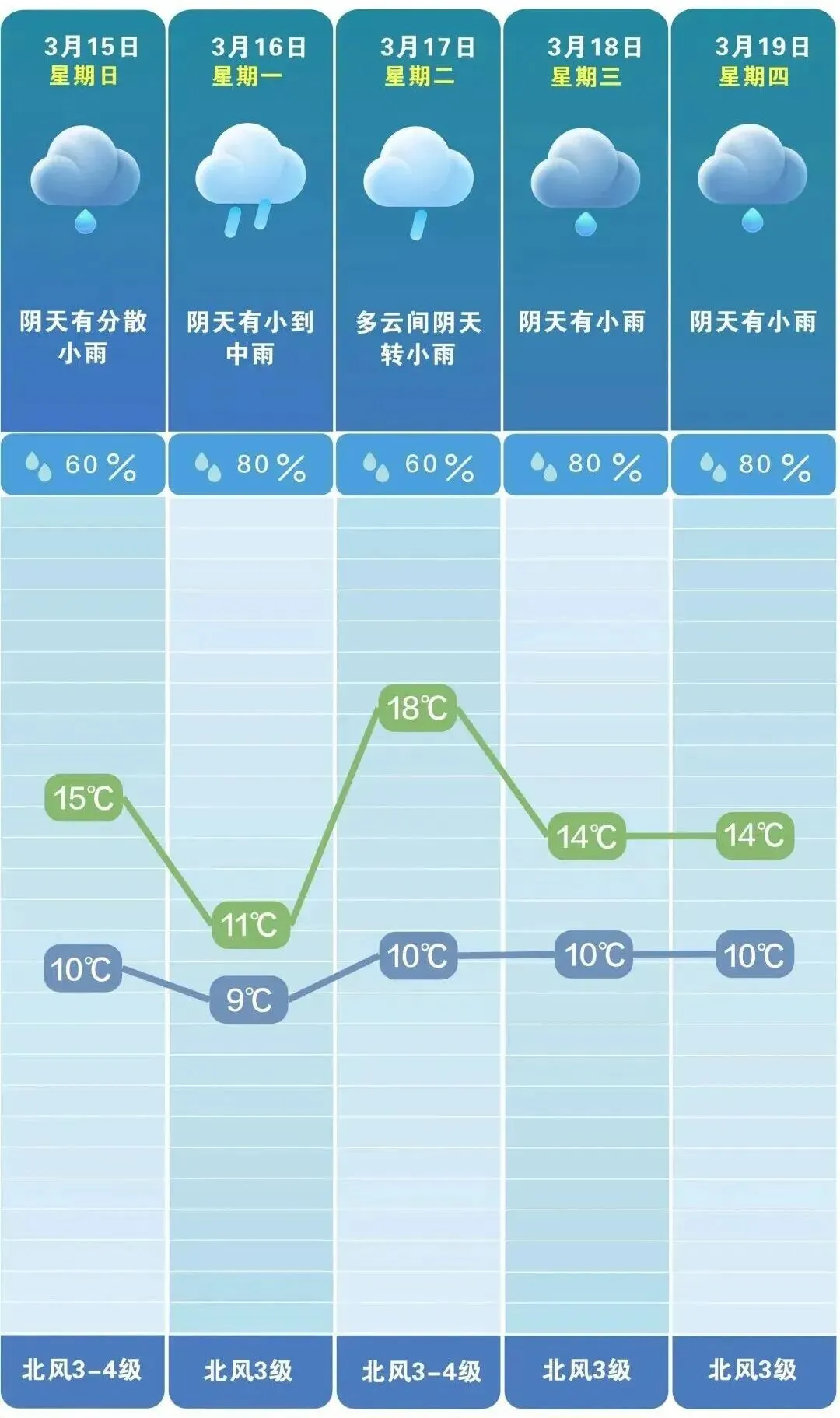 15日,阴天有分散小雨,北风4级,9~13℃;16日,阴天有小到中雨,北风3级,9~11℃。今日最小相对湿度70%,森林火险气象条件等级1-2级。