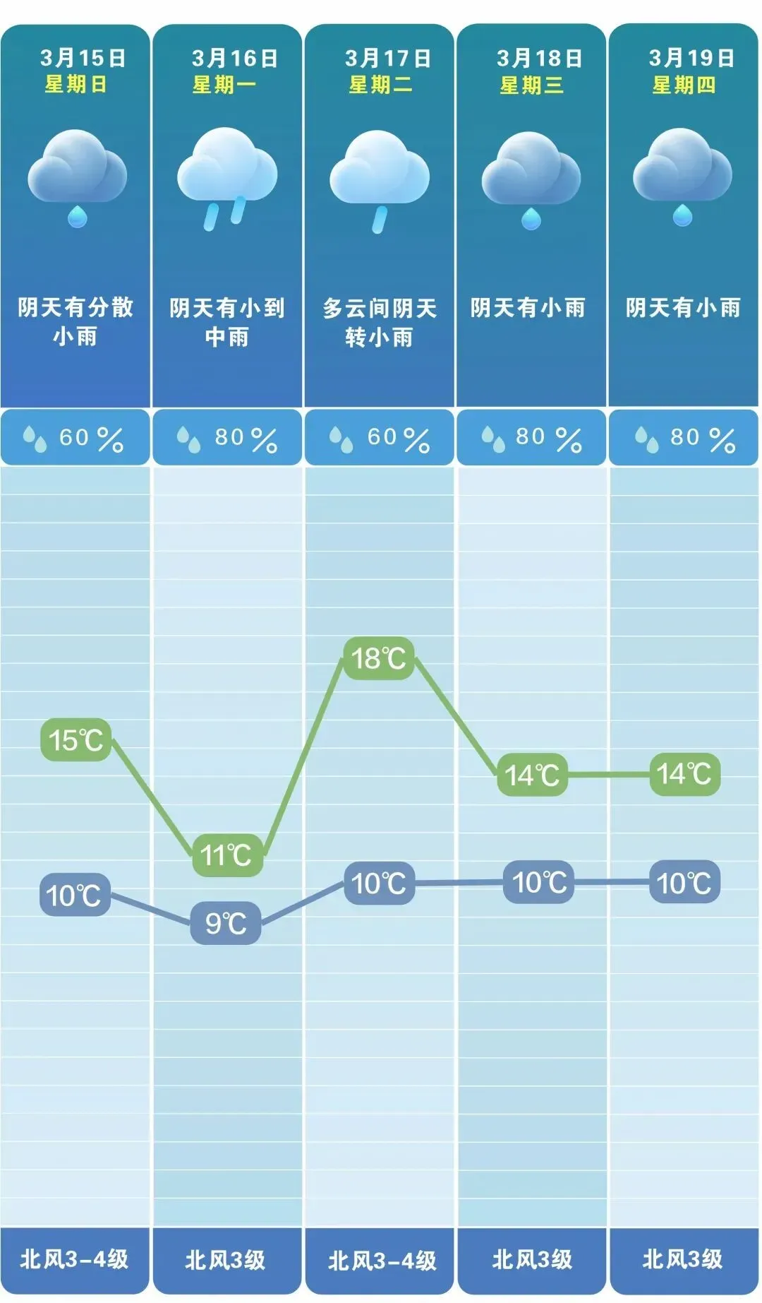 15日晚上至16日白天,湘中、湘北阴天有小到中雨,其中常德北部、益阳北部局地大雨,其他地区多云间阴天;北风3~4级减弱到2~3级;最低气温湘西、湘北7~9℃,其他地区10~12℃;最高气温湘南14~22℃,其他地区9~12℃。