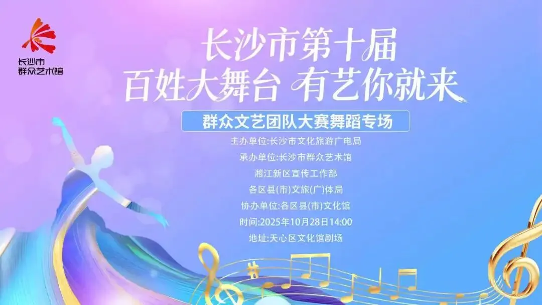 2025年10月28日,长沙市第十届“百姓大舞台 有艺你就来”群众文艺团队大赛舞蹈专场在天心区文化馆举办。来自全市各区县(市)的19支优秀文艺团队以舞为媒、以情为韵,用灵动舞姿勾勒湖湘风貌、传递民生温度,为现场观众献上了一场兼具思想性与观赏性的群众文化盛宴。