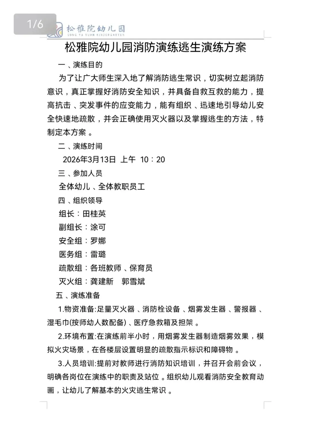 为进一步强化全园师幼消防安全意识,提高突发火灾应急处置、自救互救及快速疏散能力,筑牢园所安全防线,3月13日上午九点半,松雅院幼儿园组织开展了消防安全应急疏散演练活动。