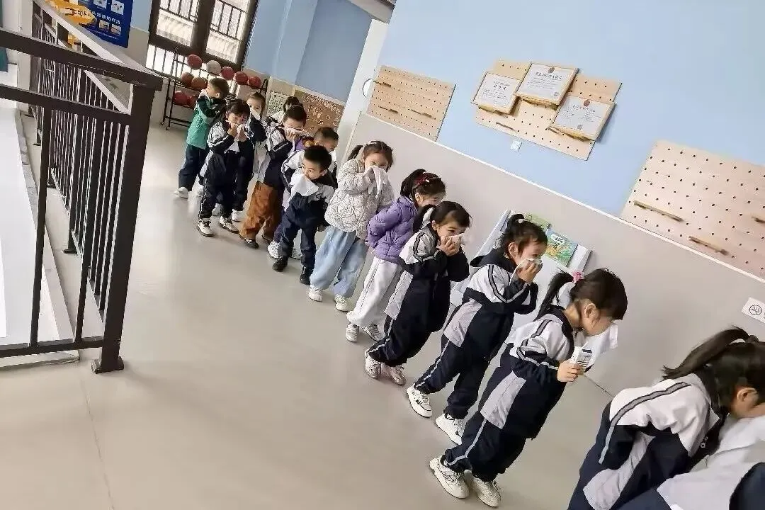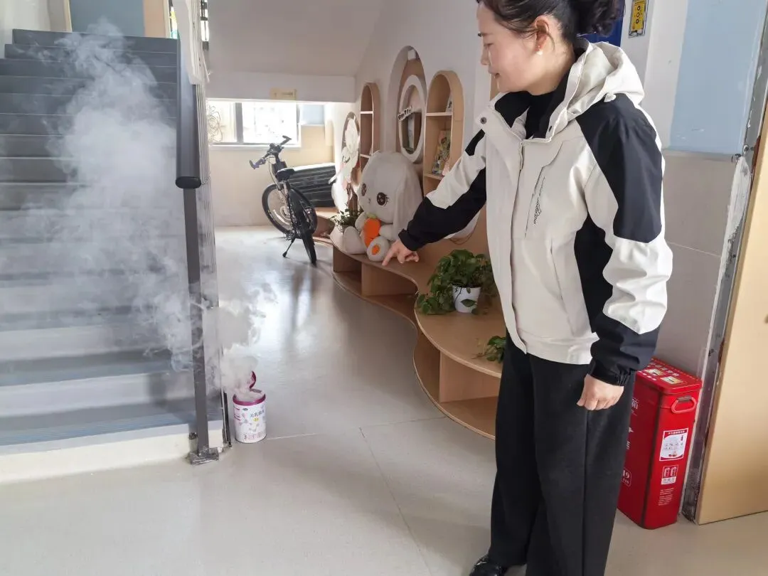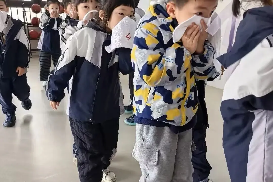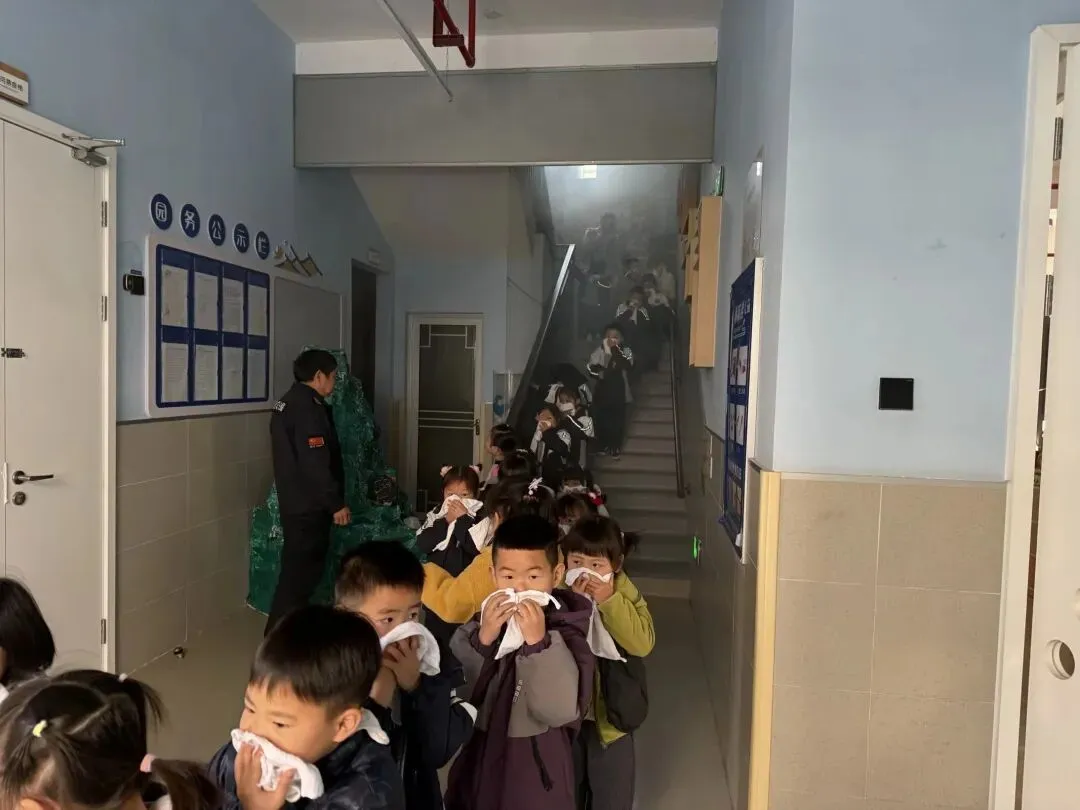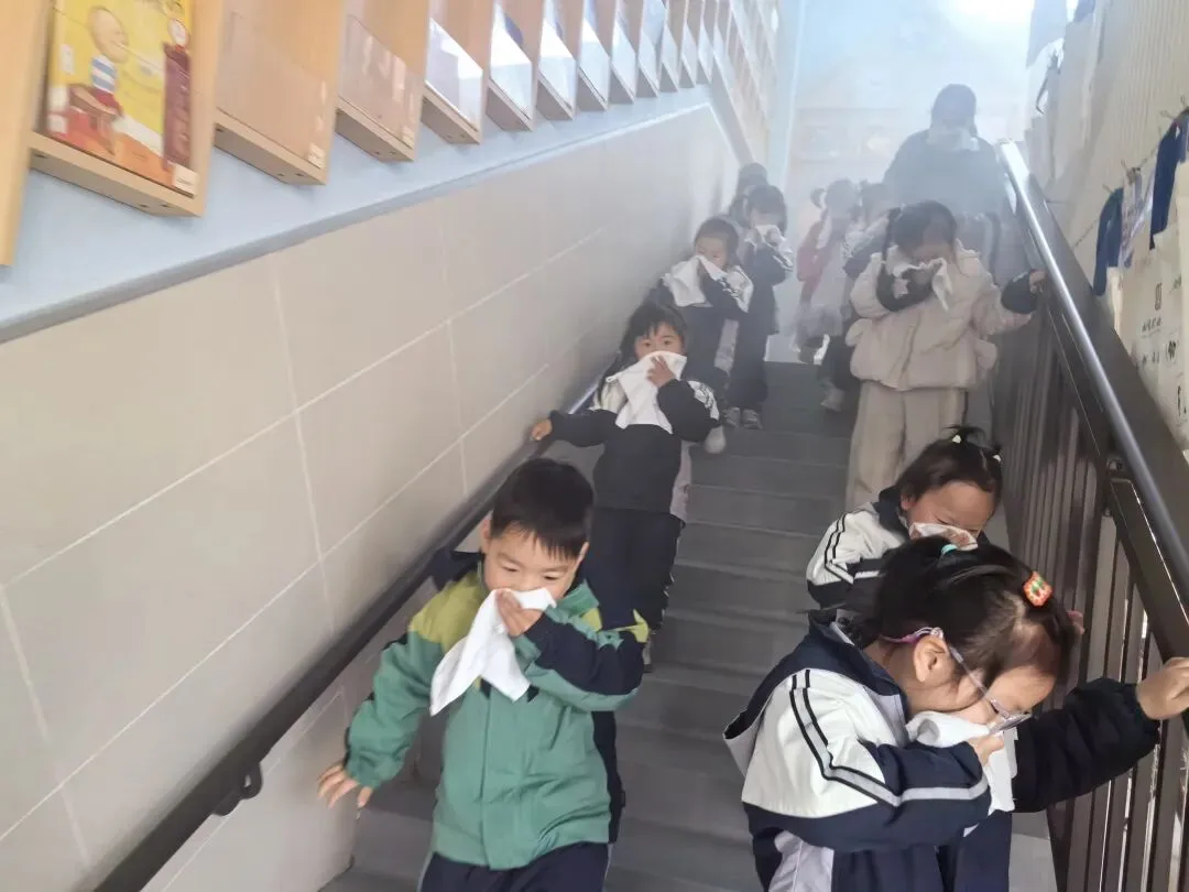 听到警报后,各班教师立即停止活动,快速组织幼儿用湿毛巾捂住口鼻、弯腰低姿,沿着预定安全路线,快速、有序、不推挤、不喧哗地撤离教学楼。整个疏散过程紧张有序、忙而不乱,全体师幼迅速撤离到户外安全集合区域。