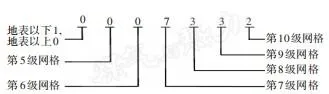 本研究在GB/T 39409—2020的技术框架与高度域剖分原则基础上,结合燃气设施埋深与地上管理需求,对其编码方案进行了适应性调整,选取高度域剖分体系的第5级网格开始记录高程,制定了由7位码元组成的高度编码体系。高度码结构示例见图4,高度码网格层级与剖分参数见表2。