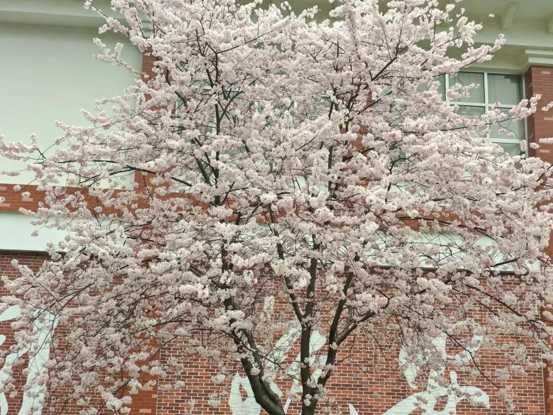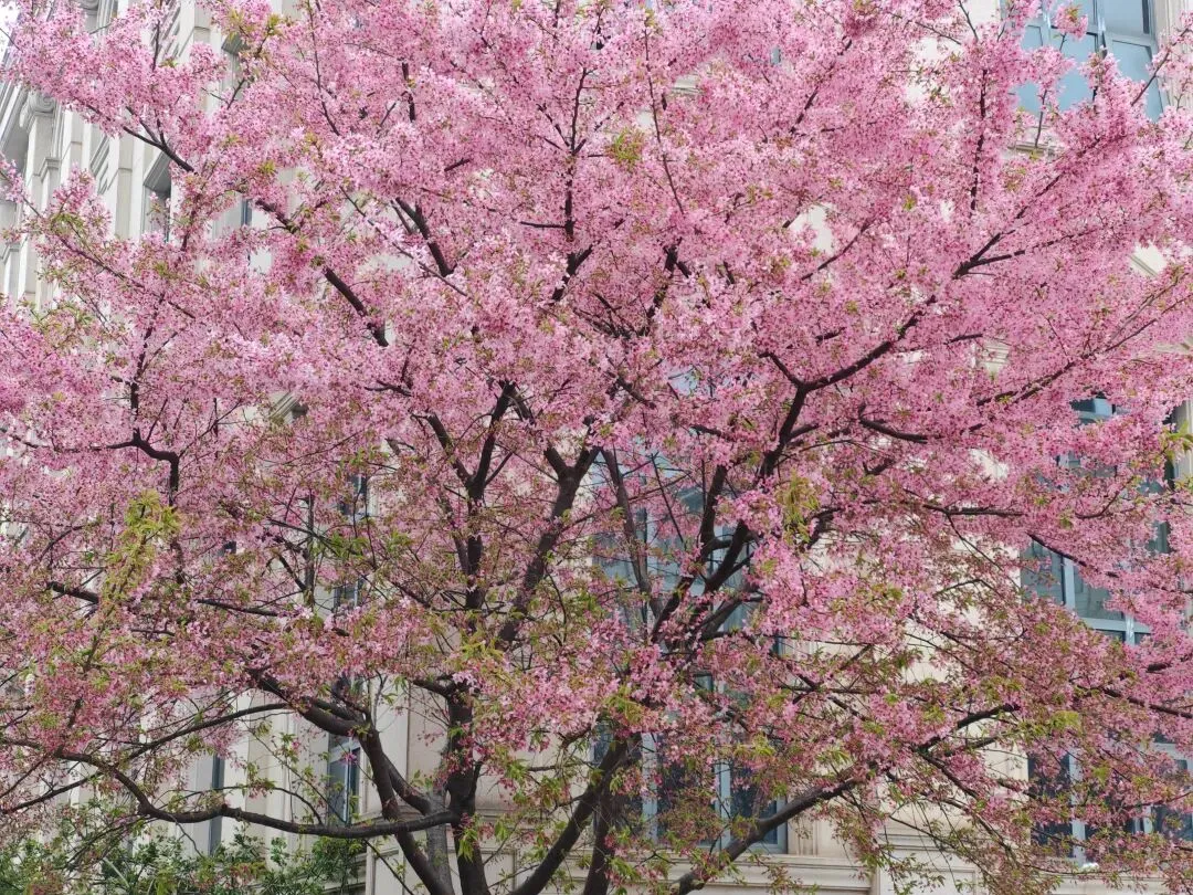 文化园办公大楼前面左右两侧的粉红色樱花已经绽放,看上去灼灼其华,像桃花一样妖艳。