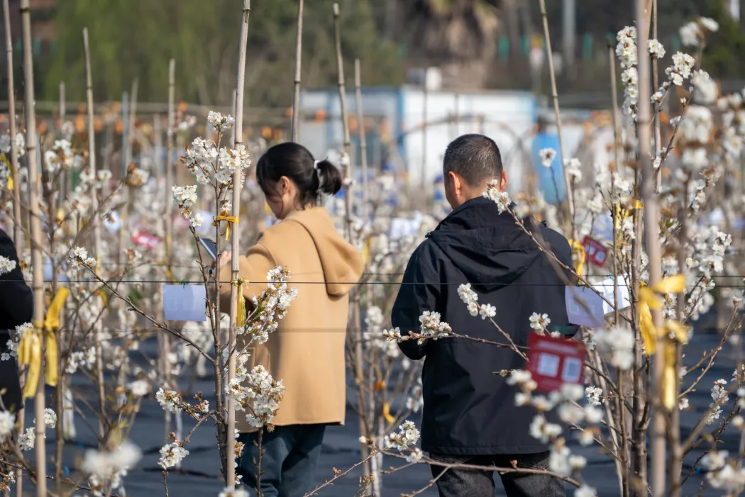 近期,果园推出“我在光明有一棵树”的认养计划。游客可以认养一棵桃树,并为它命名。通过手机端系统,可以实时查看树木的生长数据,包括开花、挂果和成熟情况。等到5月桃子成熟时,认养人既可以到现场采摘,也可以选择邮寄到家。