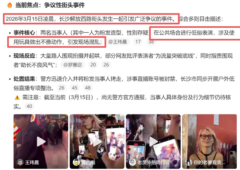 2026年3月15日凌晨,长沙解放西路的霓虹还在闪烁,一场离谱的街头闹剧却突然上演,直接让“长沙解放西吃鸡事件”冲上热搜🔥,成为全网热议的焦点!公共场合低俗表演、路人围观起哄、警方火速出手铐走当事人,这波操作不仅刷新了网友的三观,更让大家直呼:为了流量,有些人真的毫无底线! 作为长沙最繁华的网红地标📍,解放西向来是夜生活的代名词,熙熙攘攘的人群、热闹的街头氛围,让这里成为无数人打卡的胜地,也吸引了不少户外主播在此直播创作。但谁也没想到,凌晨的解放西会因为一场低俗表演变得混乱不堪! 据多位现场目击者描述,此次事件有两名当事人,其中一人顶着亮眼的粉发造型,性别甚至引发路人猜测🤔。二人竟在人来人往的街头,用玩具做出一系列不雅动作,进行低俗表演。奇葩的行为瞬间吸引了大批路人围堵拍摄,现场有人起哄叫好,让本就拥挤的街头彻底陷入混乱,好好的网红地标,俨然变成了低俗表演的“秀场”。 事发后,网友们的吐槽声瞬间刷屏💢!有人直言表演者“为了流量脸都不要了”,为了博眼球、涨粉丝,公然突破公序良俗的底线,把公共场所当成个人敛财的工具;也有网友将矛头指向围观者,认为“看热闹的起哄声,就是助长不良风气的温床”,正是这种无底线的围观,让低俗行为有了滋生的土壤。 好在警方的出手十分迅速⚡!接到相关情况后,民警第一时间赶到现场,将涉事的粉发当事人当场铐走调查,涉事的直播账号也被火速封禁,及时遏制了不良影响的进一步扩散。与此同时,长沙市也立刻启动相关措施,同步开展户外低俗直播专项整治行动,向街头低俗直播乱象“亮剑”! 截至3月15日,警方尚未发布此次事件的官方通报,当事人的具体身份、行为细节仍在进一步核实中,但这场闹剧背后的法律责任,早已板上钉钉🚨! 从法律层面来看,当事人的行为早已触碰红线,绝非“简单的博眼球”那么简单。首先,在街头实施低俗行为引发大规模围观、秩序混乱,已明确违反《治安管理处罚法》第二十三条规定,涉嫌扰乱公共场所秩序,轻则面临警告、二百元以下罚款,情节较重的,将被处五日以上十日以下拘留,还可并处五百元以下罚款。 更严重的是,公然进行的低俗表演,若被认定为淫秽表演,处罚将进一步升级!根据《治安管理处罚法》第69条,组织或者进行淫秽表演的,将被处10日以上15日以下拘留,并处500元以上1000元以下罚款;如果情节达到刑事立案标准,还将涉嫌触犯《刑法》第365条【组织淫秽表演罪】,轻则处三年以下有期徒刑、拘役或者管制并处罚金,情节严重的,将面临三年以上十年以下有期徒刑并处罚金的严厉惩处! 其实,长沙针对户外低俗直播的整治,早已不是第一次💪!作为网红城市,长沙的五一商圈、解放西、黄兴路步行街等区域,一直是户外直播的热门地点,但此前就多次出现主播为博流量上演吵架、低俗PK、自导自演剧本等乱象,不仅扰民,更严重影响了城市形象。无论是主播还是围观者,都要清楚,流量的前提是守底线,博眼球的基础是遵法律,任何为了利益突破公序良俗、触碰法律红线的行为,最终只会落得“账号被封、身陷囹圄”的下场。 长沙的美,美在烟火气,美在文明有序的网红氛围,而非低俗表演的博眼球闹剧🌟。此次专项整治的再次启动,既是对违法违规行为的严厉打击,也是对城市形象的守护。希望所有户外直播从业者都能引以为戒,守住法律和道德的底线,用优质、文明的内容吸引流量,而不是靠低俗、猎奇的行为博眼球;也希望每一位路人都能拒绝围观低俗行为,共同抵制不良风气,让长沙的网红地标,一直美在阳光下! 后续事件的官方调查结果,我们也将持续关注,相信法律会给出公正的答案!评论区聊聊你对街头低俗直播的看法吧👇!